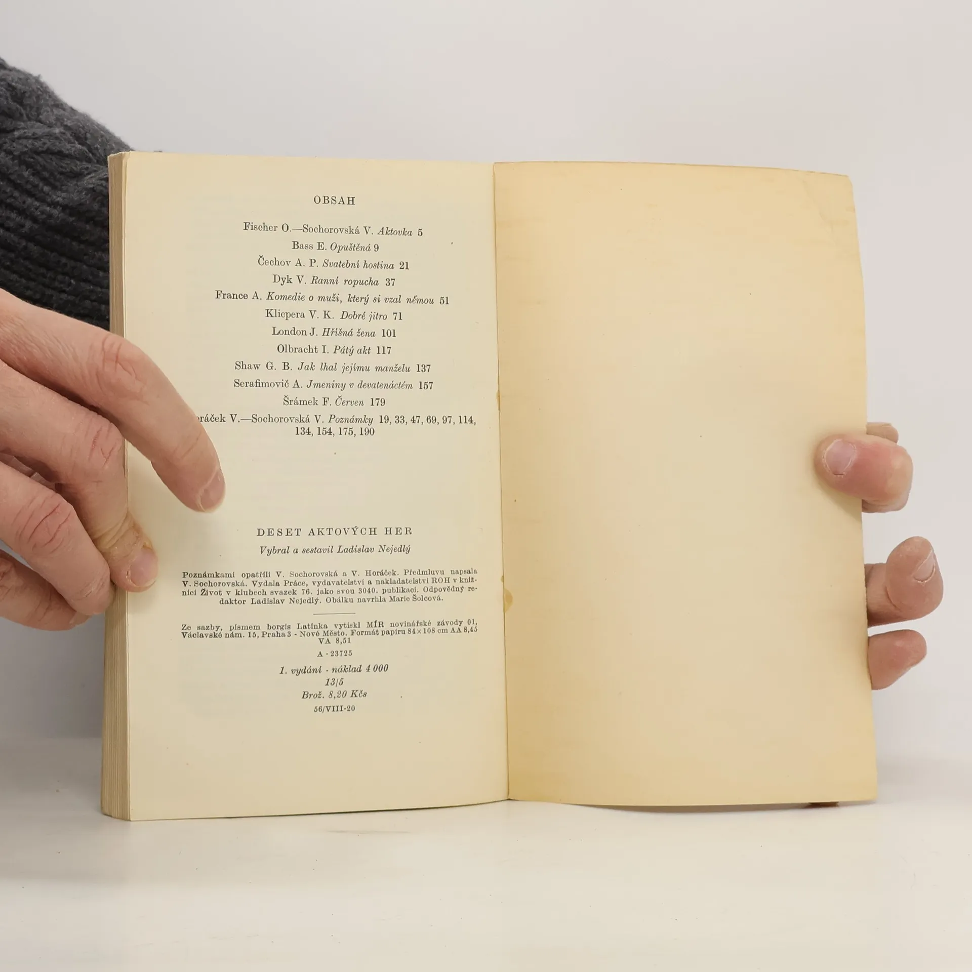 Obsahuje aktovky E. Basse (Opuštěná), A.P. Čechova (Svatební hostina), V. Dyka (Ranní ropucha), A. France (Komedie o muži, který si vzal němou), V.K. Klicpery (Dobré jitro), J. Londona (Hříšná žena), I. Olbrachta (Pátý akt), G.B. Shawa (Jak lhal jejímu manželu), A. Serafimoviče (Jmeniny v devatenáctém) a F. Šrámka (Červen). Každá z her je doprovozena stručnou charakteristikou autorova díla a inscenačními poznámkami.
