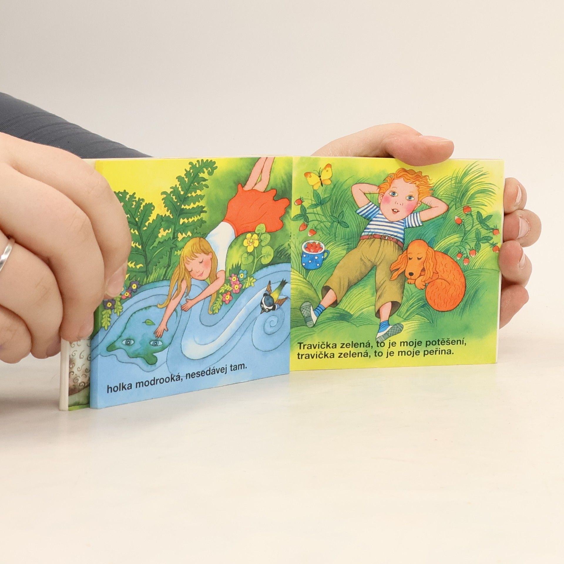 Rozkládací šestnáctiobrázkové leporelo pro děti od dvou let, s půvabnými obrázky na motivy nejznámějších dětských popěvků - Ovčáci, čtveráci, Holka modrooká, Travička zelená a dalších.