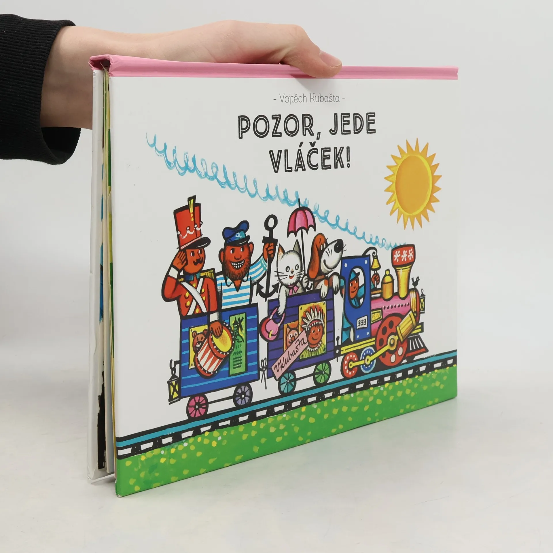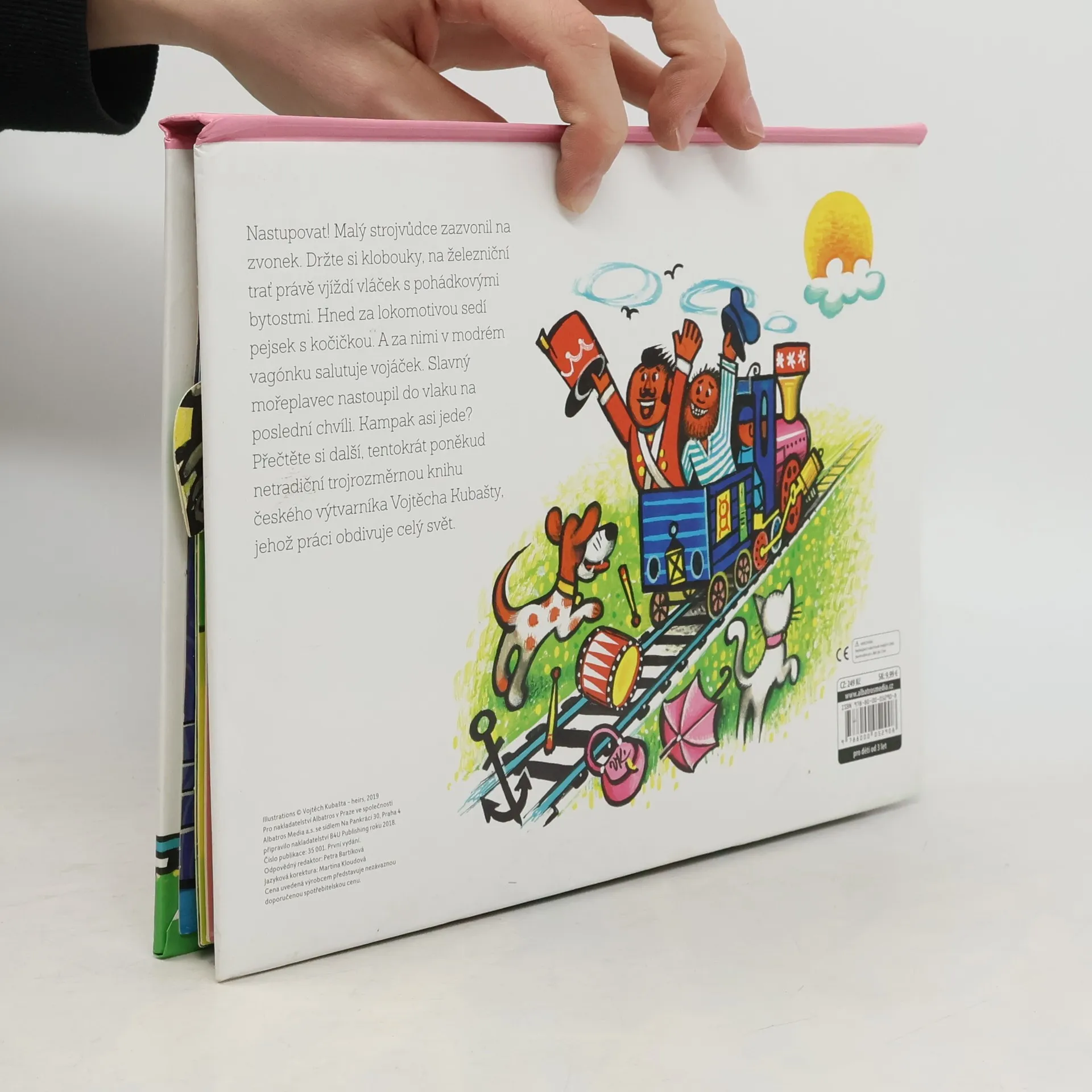 Nastupovat! Malý strojvůdce zazvonil na zvonek. Držte si klobouky, na železniční trať právě vjíždí vláček s pohádkovými bytostmi. Hned za lokomotivou sedí pejsek s kočičkou. A za nimi v modrém vagónku salutuje vojáček. Slavný mořeplavec nastoupil do vlaku na poslední chvíli. Kampak asi jede? Přečtěte si další, tentokrát poněkud netradiční trojrozměrnou knihu slavného výtvarníka Vojtěcha Kubašty, jehož práci dodnes obdivuje celý svět. V češtině vychází vůbec poprvé!