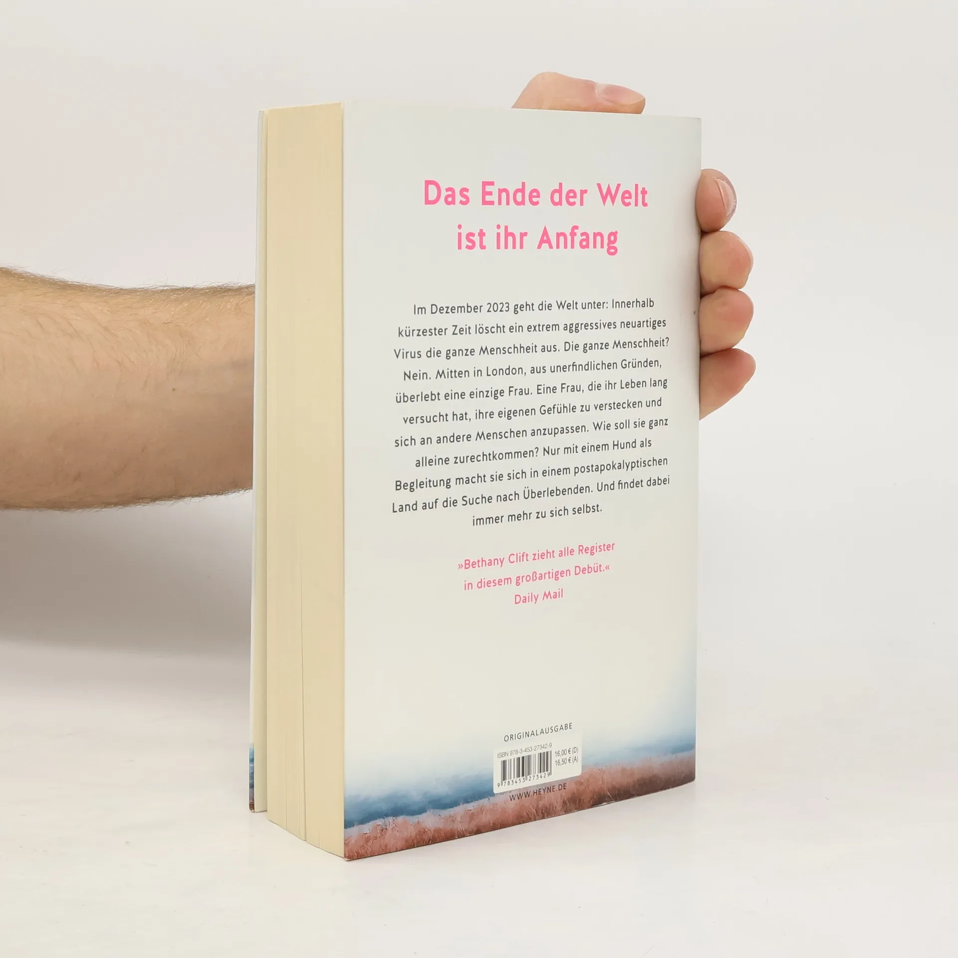 Das Ende der Welt ist ihr Anfang Im Dezember 2023 geht die Welt unter: Innerhalb kürzester Zeit löscht ein extrem aggressives neuartiges Virus die ganze Menschheit aus. Die ganze Menschheit? Nein. Mitten in London, aus unerfindlichen Gründen, überlebt eine einzige Frau. Eine Frau, die ihr Leben lang versucht hat, ihre eigenen Gefühle zu verstecken und sich an andere Menschen anzupassen. Wie soll sie ganz alleine zurechtkommen? Nur mit einem Hund als Begleitung macht sie sich in einem postapokalyptischen Land auf die Suche nach Überlebenden. Und findet dabei immer mehr zu sich selbst.