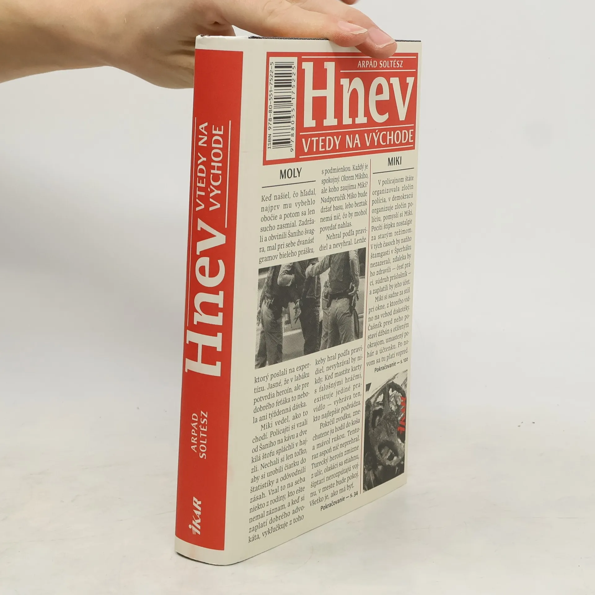 Arpád Soltész sa v treťom románe Hnev vracia k postavám svojej prvotiny Mäso, do éry mečiarizmu, keď si nikto nemohol byť istý svojím majetkom, slobodou ani životom, pokiaľ ich nedokázal ochrániť hrubou silou alebo politickými konexiami. Ani tento jeho príbeh nemá kladných hrdinov. Je o normálnych ľuďoch v nenormálnych podmienkach. Zajtra to môžete byť vy. Uliciam deväťdesiatych rokov vládnu gangy šuštiakových mafiánov, no najmocnejšou organizovanou zločineckou skupinou je Slovenská informačná služba, tou najväčšou zasa policajný zbor. Len poručík Molnár je blázon, ktorý si obliekol uniformu, aby čistil mesto od zločinu. Stáva sa tak zrnkom piesku v súkolí dobre rozbehnutého stroja na peniaze. Ten ho, samozrejme, okamžite zomelie. Miki Miko je iný typ policajta. Nekrúti sa spolu s ostatnými kolieskami mašinérie, no nie je ani blázon. Vie, že keď sedí pri stole s falošnými hráčmi, vyhráva ten, kto najlepšie podvádza. A pokiaľ hráte o život, cena fair play sa naozaj neráta. Keď mu zabijú partnera a systém spravodlivosti urobí aj nemožné, aby ochránil vrahov, zostáva iba pomsta. No Konfucius sa mýlil, vykopať dva hroby, než sa vydá na jej cestu, by ani zďaleka nestačilo.