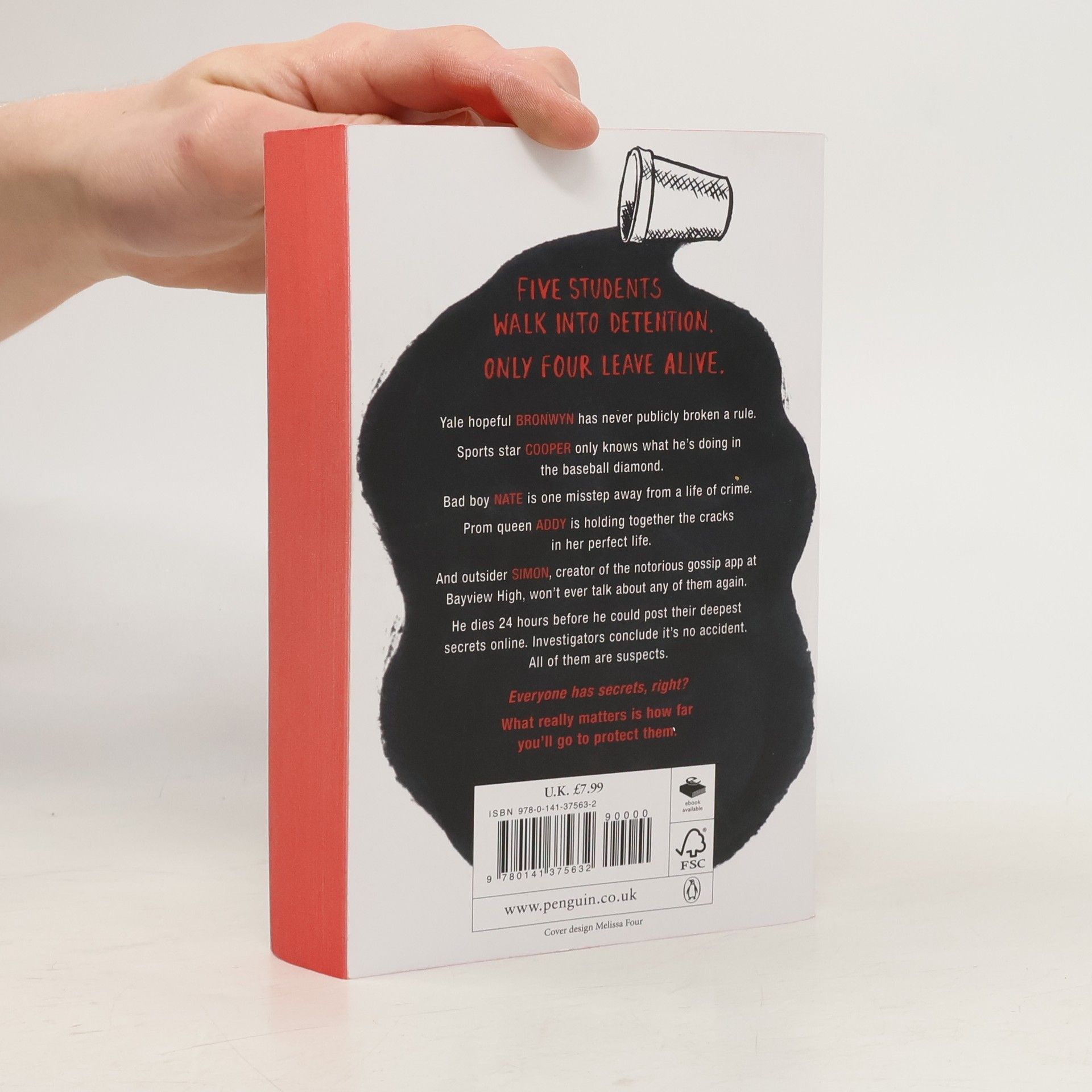 On Thursday afternoon, five students at Bayview High walk into detention. Bronwyn,the brain, is Yale-bound and never breaks a rule. Addy, the beauty, is the picture-perfect homecoming princess. Nate,the criminal,is already on probation for dealing. Cooper,the athlete,is the all-star baseball pitcher. And Simon,the outcast,is the creator of Bayview High's notorious gossip app. Only, Simon never makes it out of that classroom. Before the end of detention, Simon's dead. And according to investi-gators, his death wasn't an accident. On Thursday, he died. But on Friday, he'd planned to post juicy reveals about all four of his high-profile classmates, which makes all four of them suspects in his murder. Or are they just the perfect patsies for a killer who's still on the loose? Everyone has secrets, right? What really matters is how far you would go to protect them.