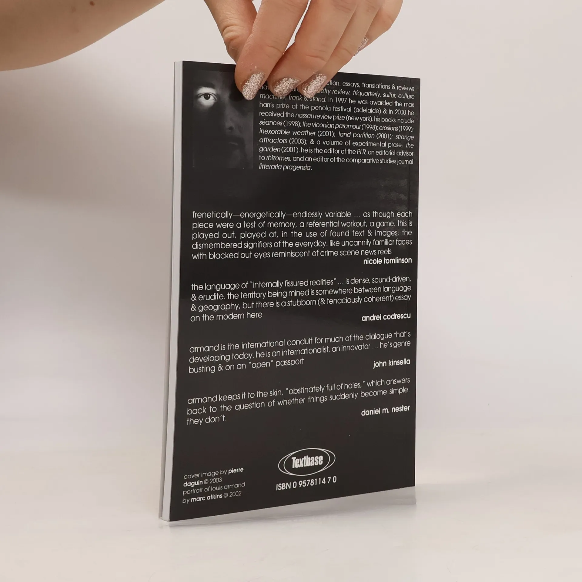 Armand is very much interested in the contemporary, and in this book he presents his reader with a bruising entourage of scenes, images and juxtapositions wrenched from combinations of everyday urban life and ideas --Michael Aikin, Cordite The suggestion, the promise of a narrative seems implicit in Armand’s work. ...As though each piece were a test of memory, a referential work out, a game. This is played out, played at, most obviously in the use of ... found images, the dismembered signifiers of the everyday. Uncannily familiar faces with blacked out eyes reminiscent of crime scene news reels ... --Nicole Tomlinson
