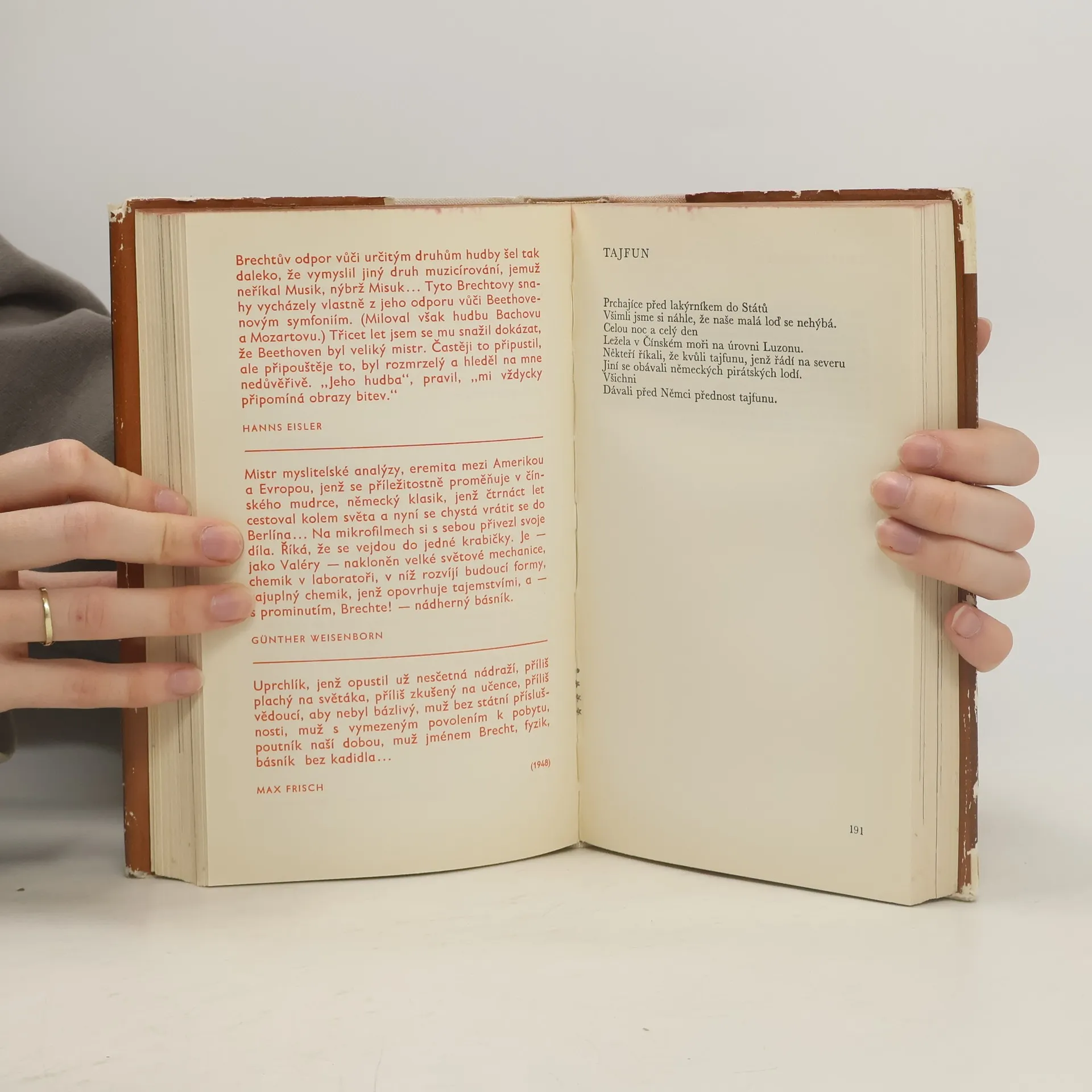 Výbor z díla předního německého básníka, spisovatele, dramatika a zejména pak divadelního teoretika. Zahrnuje ukázky z jeho lyriky, hry Život Galileiho (1939) a Šesťáková opera (1928), výbor z drobných satirických próz Historky o panu Keunerovi, úryvky z politicky orientovaných satirických dialogů Hovory na útěku a úryvky z teoretických prací o divadle a z myšlenek o umění.
