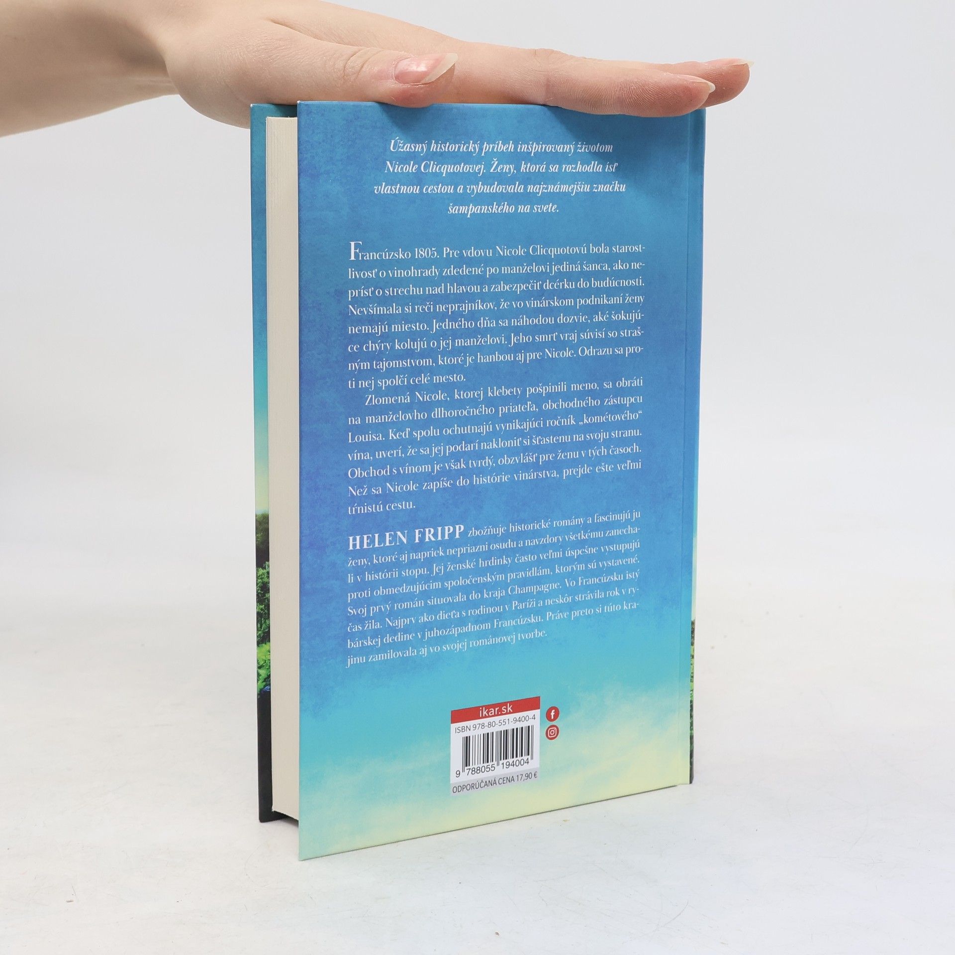 Úžasný historický príbeh inšpirovaný životom Nicole Clicquotovej. Ženy, ktorá sa rozhodla ísť vlastnou cestou a vybudovala najznámejšiu značku šampanského vo svete. Francúzsko, 1805. Pre vdovu Nicole Clicquotovú bola starostlivosť o vinohrady zdedené po manželovi jediná šanca ako neprísť o strechu nad hlavou a zabezpečiť dcérku do budúcnosti. Nevšímala si reči neprajníkov, že vo vinárskom podnikaní ženy nemajú miesto. Jedného dňa sa nechtiac dozvie, aké šokujúce klebety kolujú o jej manželovi. Vraj jeho smrť je spojená so strašným tajomstvom, ktoré je hanbou aj pre Nicole. Odrazu sa proti nej spojí celé mesto. Zlomená Nicole, ktorej klebety pošpinili meno, sa obráti na dlhoročného priateľa svojho manžela, obchodného zástupcu Louisa. Zdá sa, že jeho milý úsmev a láskavé rady jej pomôžu vyrovnať sa s problémami. Keď spolu ochutnajú vynikajúci ročník jej „kométového“ vína, uverí, že sa jej podarí nakloniť si šťastenu na svoju stranu. Obchod s vínom je však tvrdý, obzvlášť pre ženu v tých časoch. Než sa Nicole zapíše do histórie vinárstva, prejde ešte veľmi tŕnistú cestu.
