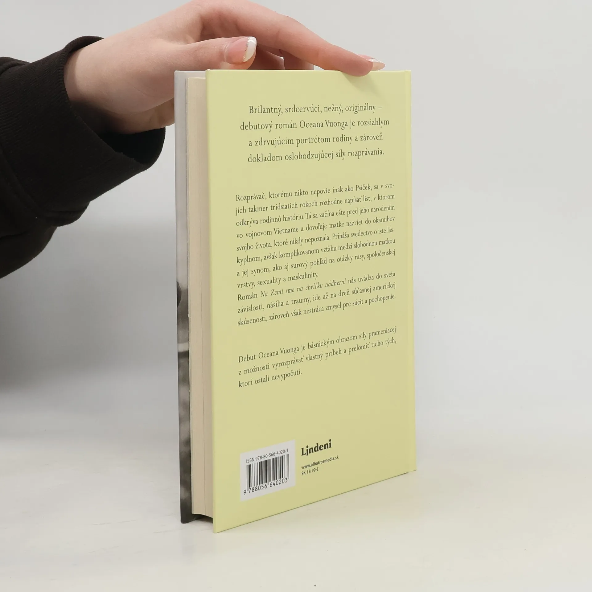 Brilantný, srdcervúci, nežný, originálny – debutový román Oceana Vuonga je rozsiahlym a zdrvujúcim portrétom rodiny a zároveň dokladom oslobodzujúcej sily rozprávania. Rozprávač, ktorému nikto nepovie inak ako Psíček, sa v svojich takmer tridsiatich rokoch rozhodne napísať list, v ktorom odkrýva rodinnú históriu. Tá sa začína ešte pred jeho narodením vo vojnovom Vietname a dovoľuje matke nazrieť do okamihov svojho života, ktoré nikdy nepoznala. Román prináša svedectvo o iste láskyplnom, avšak komplikovanom vzťahu medzi slobodnou matkou a jej synom, ako aj surový pohľad na otázky rasy, spoločenskej vrstvy, sexuality a maskulinity. Román Na Zemi sme na chvíľku nádherní nás uvádza do sveta závislosti, násilia a traumy, ide až na dreň súčasnej americkej skúsenosti, zároveň však nestráca zmysel pre súcit a pochopenie. Román Oceana Vuonga je básnickým obrazom sily prameniacej z možnosti vyrozprávať vlastný príbeh a prelomiť ticho tých, ktorí ostali nevypočutí.