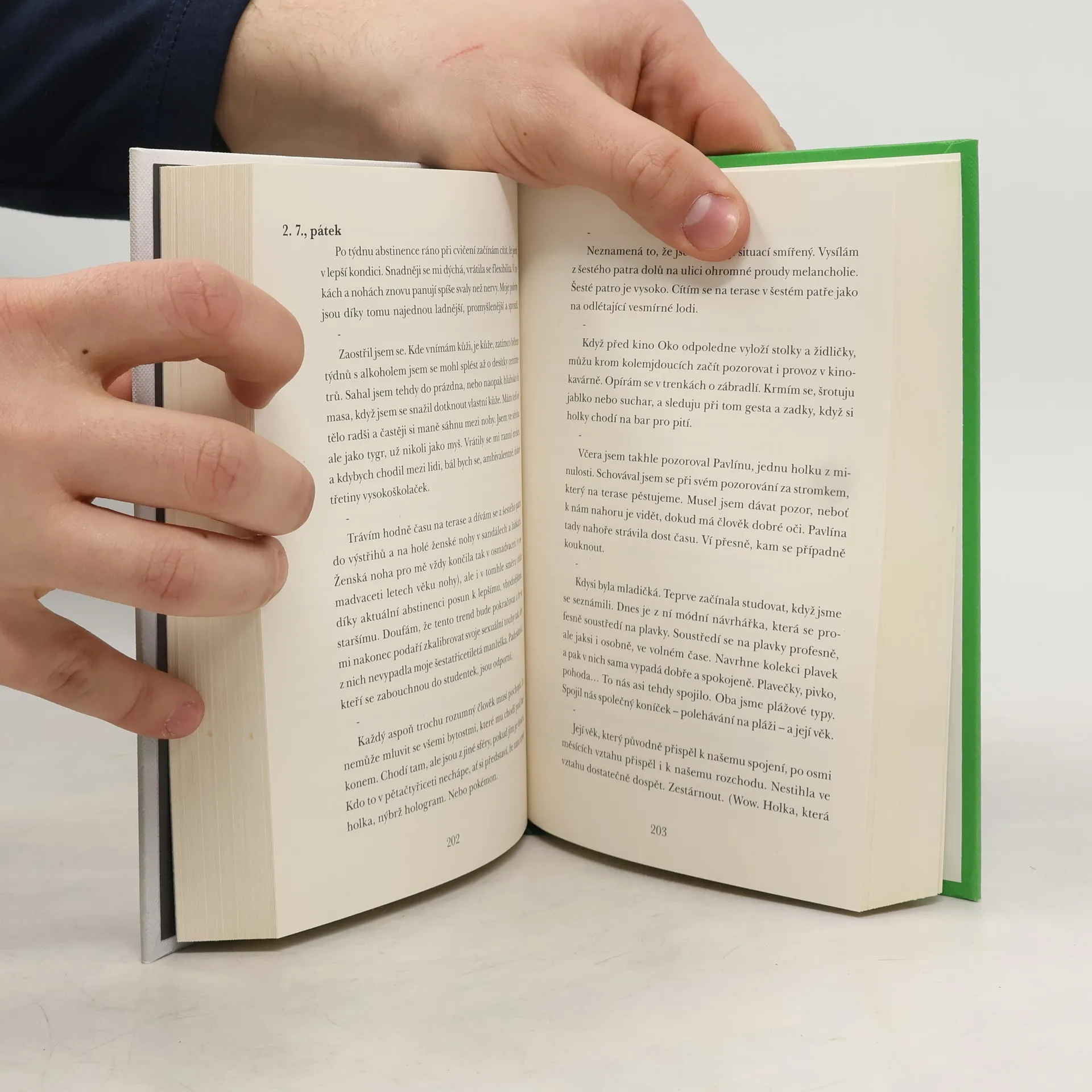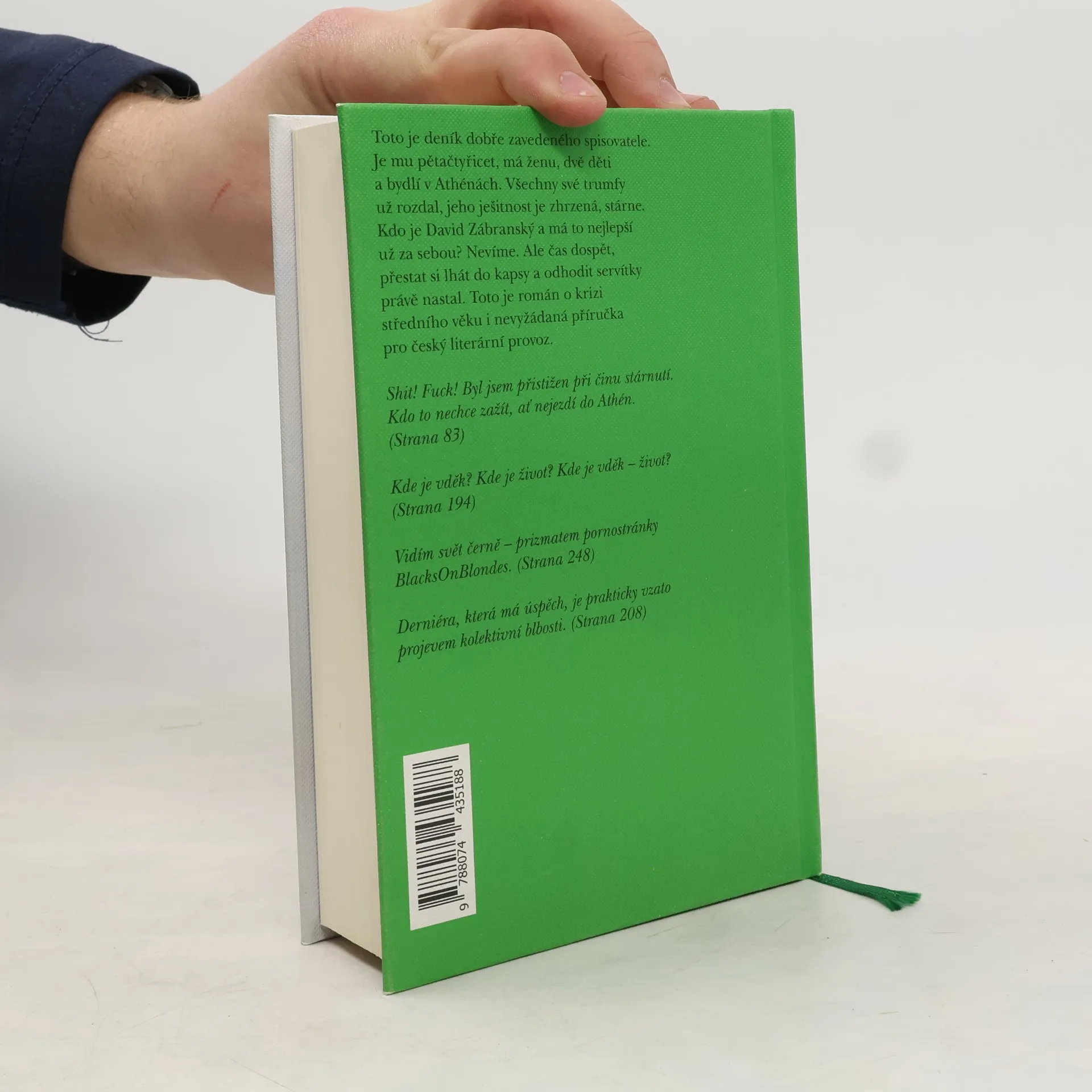 Toto je deník dobře zavedeného spisovatele. Je mu pětačtyřicet, má ženu, dvě děti a bydlí v Athénách. Všechny své trumfy už rozdal, jeho ješitnost je zhrzená, stárne. Kdo je David Zábransky a má to nejlepší už za sebou? Nevíme. Ale čas dospět, přestat si lhát do kapsy a odhodit servítky právě nastal. Toto je román o krizi středního věku i nevyžádaná přírucka pro česky literární provoz. Shit! Fuck! Byl jsem přistižen při činu stárnutí. Kdo to nechce zažít, ať nejezdí do Athén. (Strana 83) Kde je vděk? Kde je život? Kde je vděk – život? (Strana 194) Vidím svět černě – prizmatem pornostránky BlacksOnBlondes. (Strana 248) Derniéra, která má úspěch, je prakticky vzato projevem kolektivní blbosti. (Strana 208)