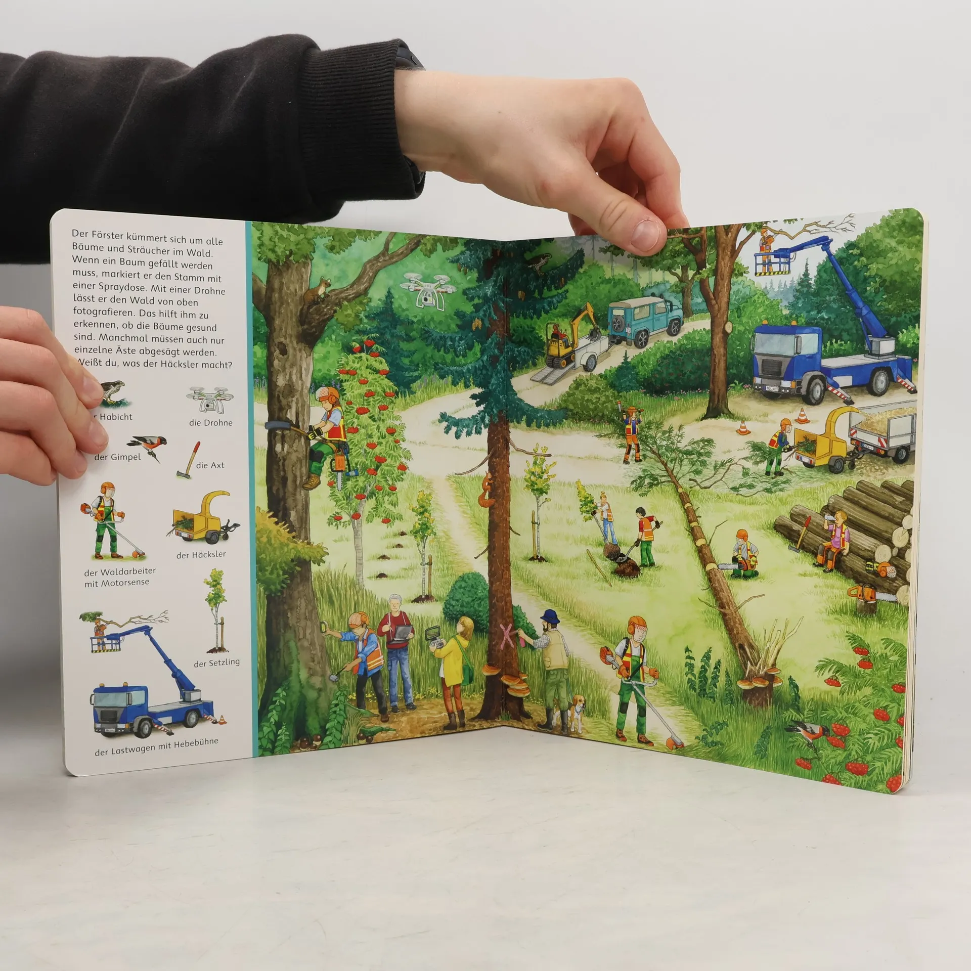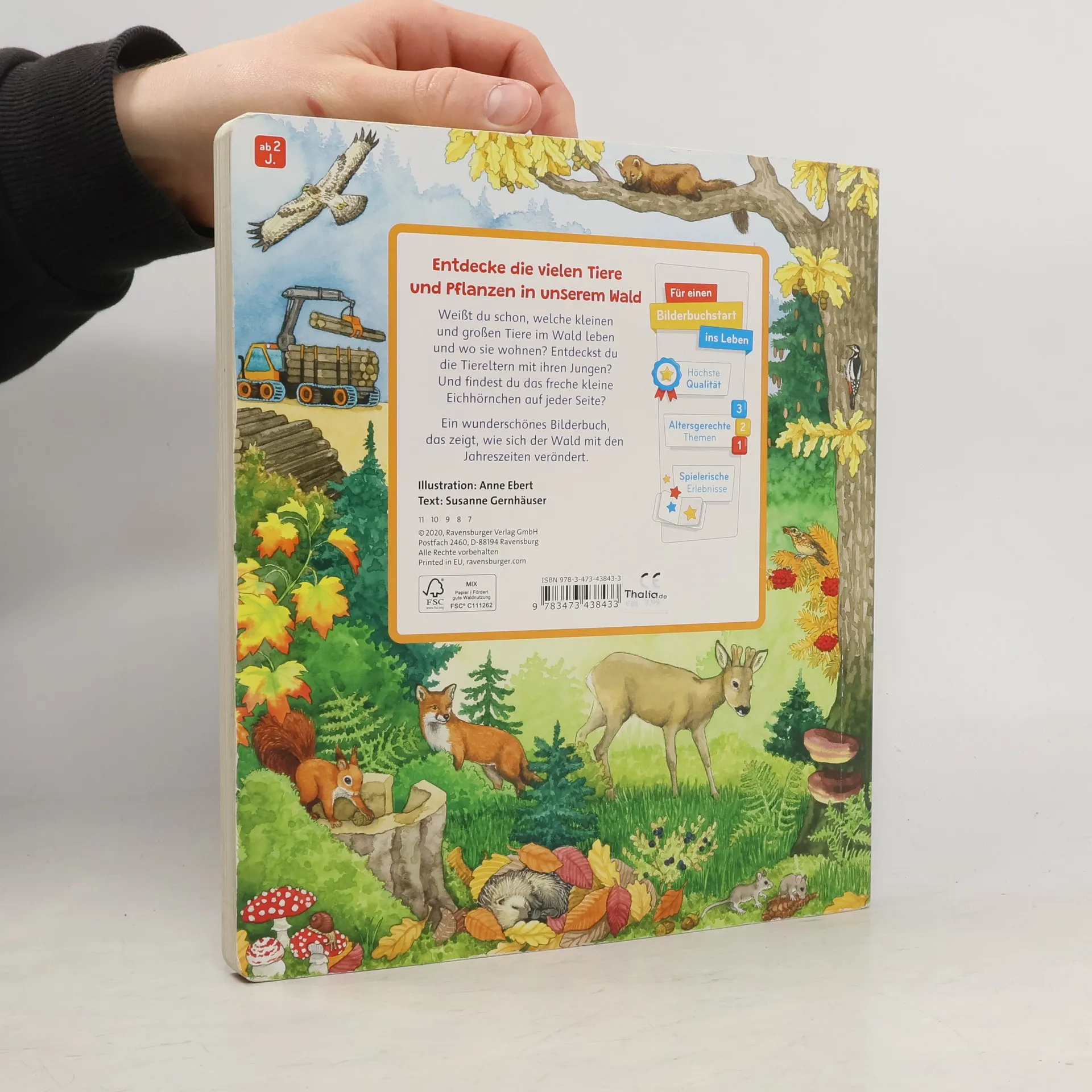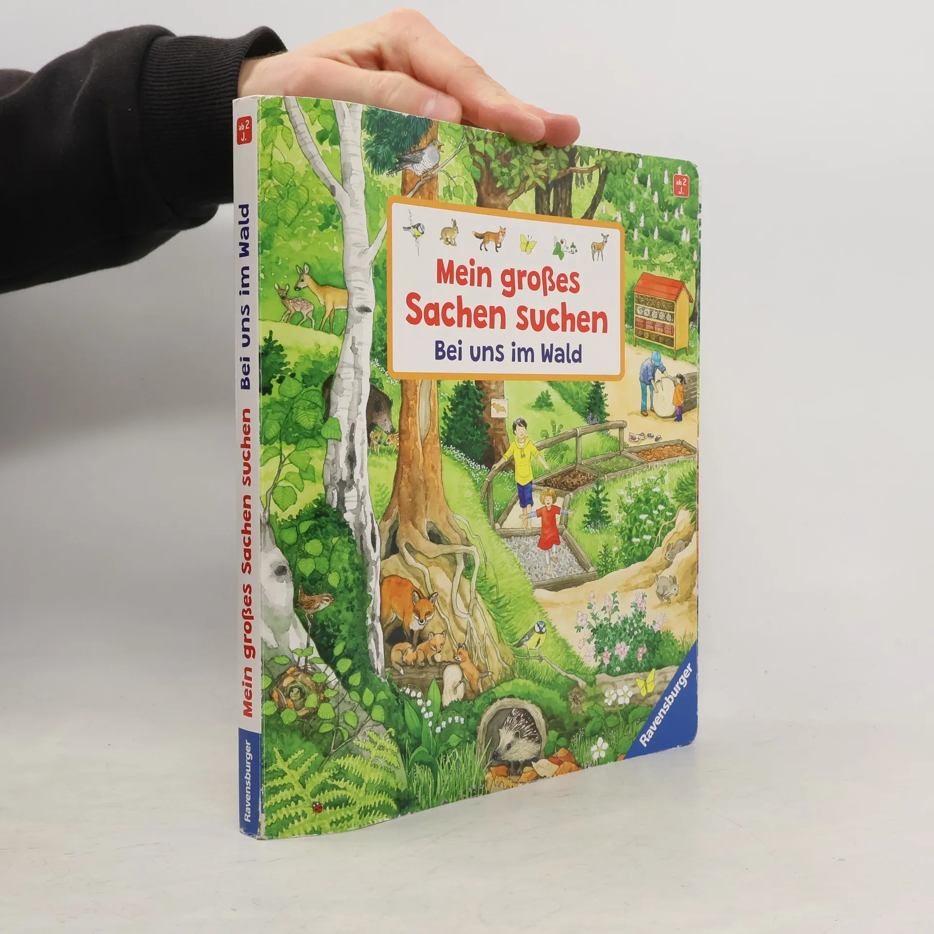 Komm mit, wir gehen zusammen in den Wald! Auf 11 großen, naturgetreuen Wimmelbildern werden Tiere und Pflanzen lebendig. Wie heißen sie? Haben die Tierkinder eigene Namen? Und was kann man alles in einem Waldkindergarten machen? Die stimmungsvollen Bilder zeigen den Wald und seine Bewohner in allen Jahreszeiten, während kleine Suchbilder am Rand der Seiten zum Entdecken einladen. Dieses Pappbilderbuch weckt die Neugier auf das spannende Thema Wald. Weißt du schon, welche Tiere in unserem Wald leben und wo sie wohnen? Entdeckst du die Tiereltern mit ihren Jungen? Findest du das freche Eichhörnchen auf jeder Seite? Und wie bereiten sich die Waldtiere auf den Winter vor? Das große Interesse an der Natur rückt das Thema „Wald“ für Familien mit kleinen Kindern in den Fokus. Dieser „Sachen suchen“ Titel vermittelt spielerisch erstes Sachwissen und fordert dazu auf, genau hinzusehen. Bei einem Waldspaziergang sind vor allem die Pflanzen sichtbar, während die scheuen Tiere oft verborgen bleiben. In den detaillierten, realitätsnahen Illustrationen sind sie versammelt. Schau, wie sich der Wald im Lauf der Jahreszeiten verändert: Im Frühling kommen die Tiere zum Bach, im Sommer kann man sie vom Hochsitz aus beobachten, im Herbst gibt es einen Besuch im Waldkindergarten, und im Winter zeigt sich der verschneite Wald mit Tierspuren. Ein besonderes Waldbilderbuch, das dazu einlädt, den Lebensraum Wald besser kennenzulernen.