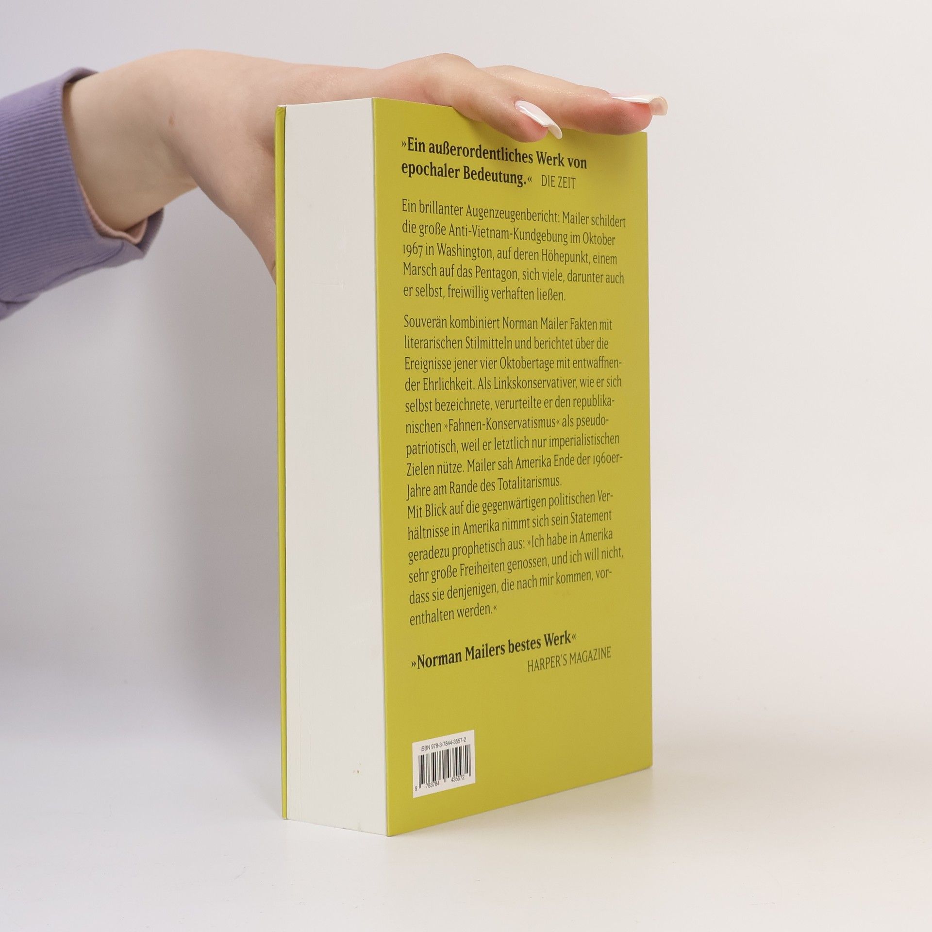 Mailers brillant geschriebener Augenzeugenbericht über die große Anti-Vietnam-Kundgebung im Oktober 1967 in Washington. Die Demonstration erreichte ihren Höhepunkt in einem Marsch auf das Pentagon, bei dem viele, darunter auch Norman Mailer selbst, sich freiwillig verhaften ließen. Der Autor und Journalist, der als sein eigener komischer Held durch diese vier Oktobertage geht, schildert sich selbst und die Vorgänge mit entwaffnender Ehrlichkeit. Mailer sieht die USA Ende der 1960er-Jahre als ein Land am Rande des Totalitarismus – ein beinahe prophetischer Vorgriff auf die Verhältnisse im Amerika von heute.