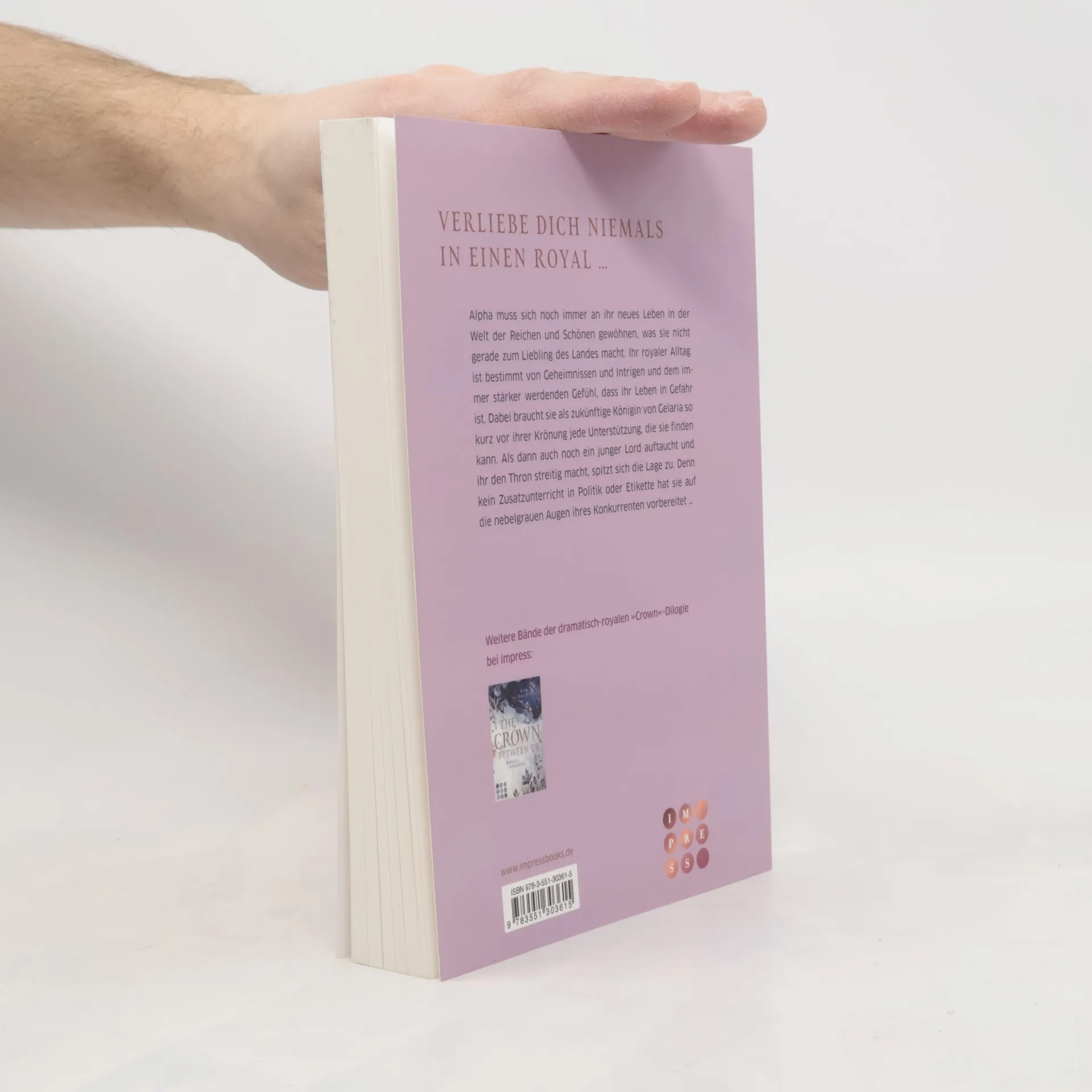 **Verliebe dich niemals in einen Royal …** Alpha muss sich noch immer an ihr neues Leben in der Welt der Reichen und Schönen gewöhnen, was sie nicht gerade zum Liebling des Landes macht. Ihr royaler Alltag ist bestimmt von Geheimnissen und Intrigen und dem immer stärker werdenden Gefühl, dass ihr Leben in Gefahr ist. Dabei braucht sie als zukünftige Königin von Gelaria so kurz vor ihrer Krönung jede Unterstützung, die sie finden kann. Als dann auch noch ein junger Lord auftaucht und ihr den Thron streitig macht, spitzt sich die Lage zu. Denn kein Zusatzunterricht in Politik oder Etikette hat sie auf die nebelgrauen Augen ihres Konkurrenten vorbereitet … Pflicht oder Liebe? Ein royales Geheimnis, ein königlicher Bad Boy und eine starke Frau, in der mehr steckt, als sie ahnt. Knisternd und herzzerreißend spannend bis zur letzten Seite! //Dies ist der zweite Band der dramatisch-royalen »Crown«-Dilogie. Alle Romane der fesselnden Lovestory bei Impress: -- The Crown Between Us. Royales Geheimnis -- The Crown Between Us. Royale Pflicht -- Sammelband der romantischen Romance-Dilogie »The Crown Between Us«// Diese Buchreihe ist abgeschlossen.