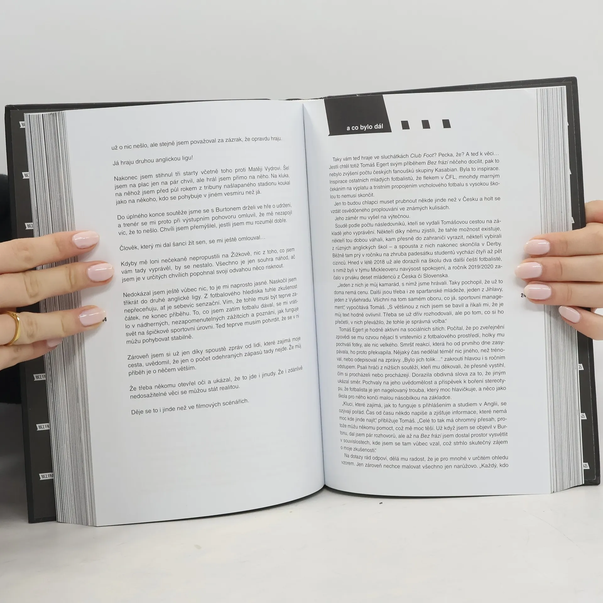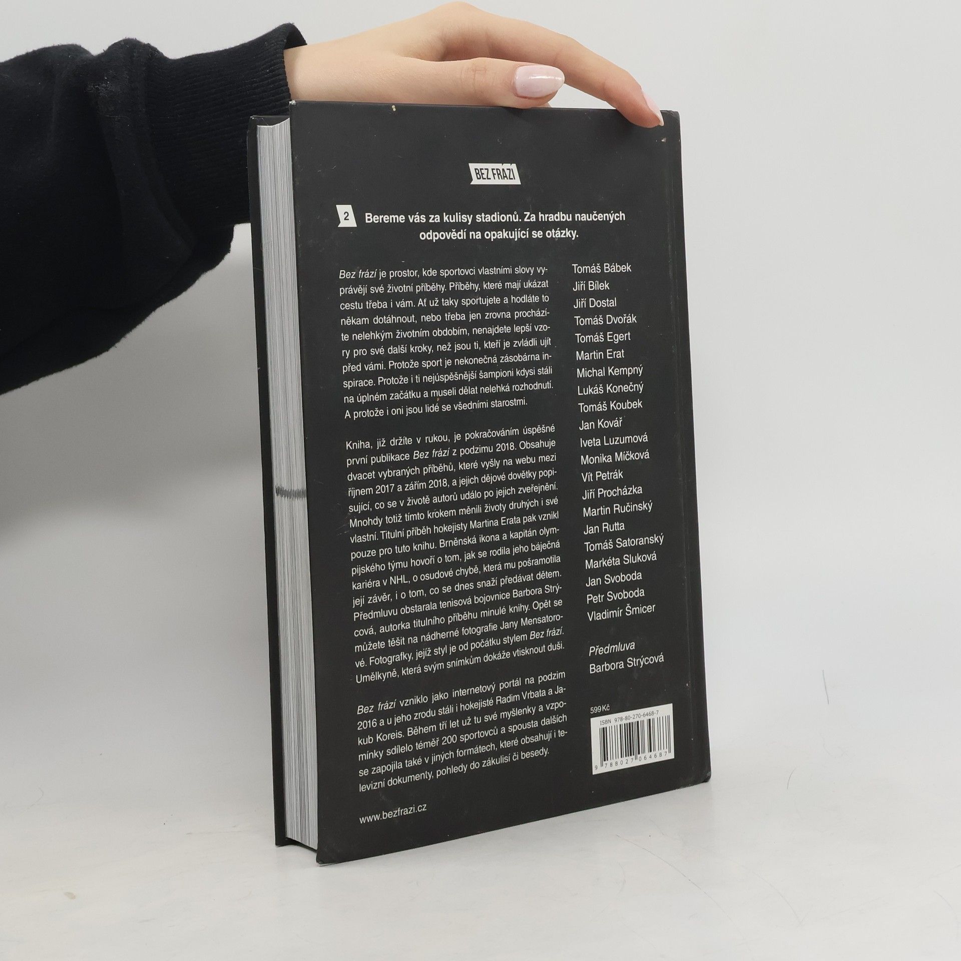 Životní příběhy sportovců jejich vlastními slovy. Když sportovci mluví bez frází, je co poslouchat… Tato kniha je pokračováním úspěšné první publikace z podzimu 2018. Obsahuje dvacet vybraných příběhů, které vyšly na webovém portálu Bez frází mezi říjnem 2017 a zářím 2018, a jejich dějové dovětky, popisující, co se s autory událo po jejich zveřejnění. Mnohdy totiž tímto krokem měnili životy druhých i své vlastní. Titulní příběh hokejisty Martina Erata pak vznikl pouze pro tuto knihu. Brněnská ikona a kapitán olympijského týmu v něm hovoří o tom, jak se rodila jeho výjimečná kariéra v NHL, o osudové chybě, která mu pošramotila její konec, i o tom, co se dnes snaží předávat dětem. Předmluvu obstarala Barbora Strýcová, tvář první knihy.