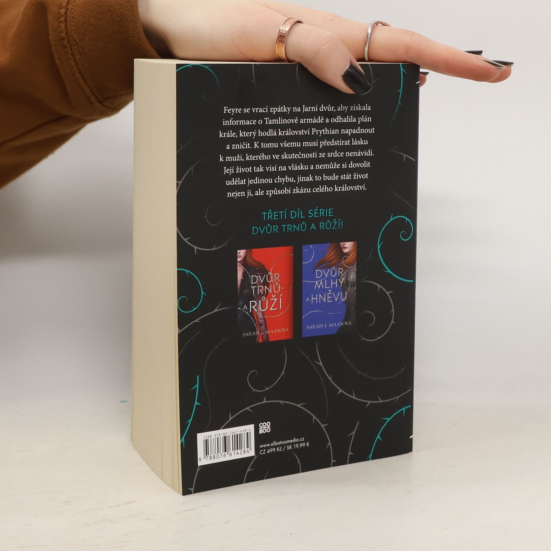 Třetí díl bestsellerové YA fantasy série Dvůr trnů a růží. Feyre se vrací zpátky na Jarní dvůr, aby získala informace o Tamlinově armádě a odhalila plán krále, který hodlá království Prythian napadnout a zničit. K tomu všemu musí předstírat lásku k muži, kterého ve skutečnosti ze srdce nenávidí. Její život tak visí na vlásku a nemůže si dovolit udělat jedinou chybu, jinak to bude stát život nejen ji, ale způsobí zkázu celého království.