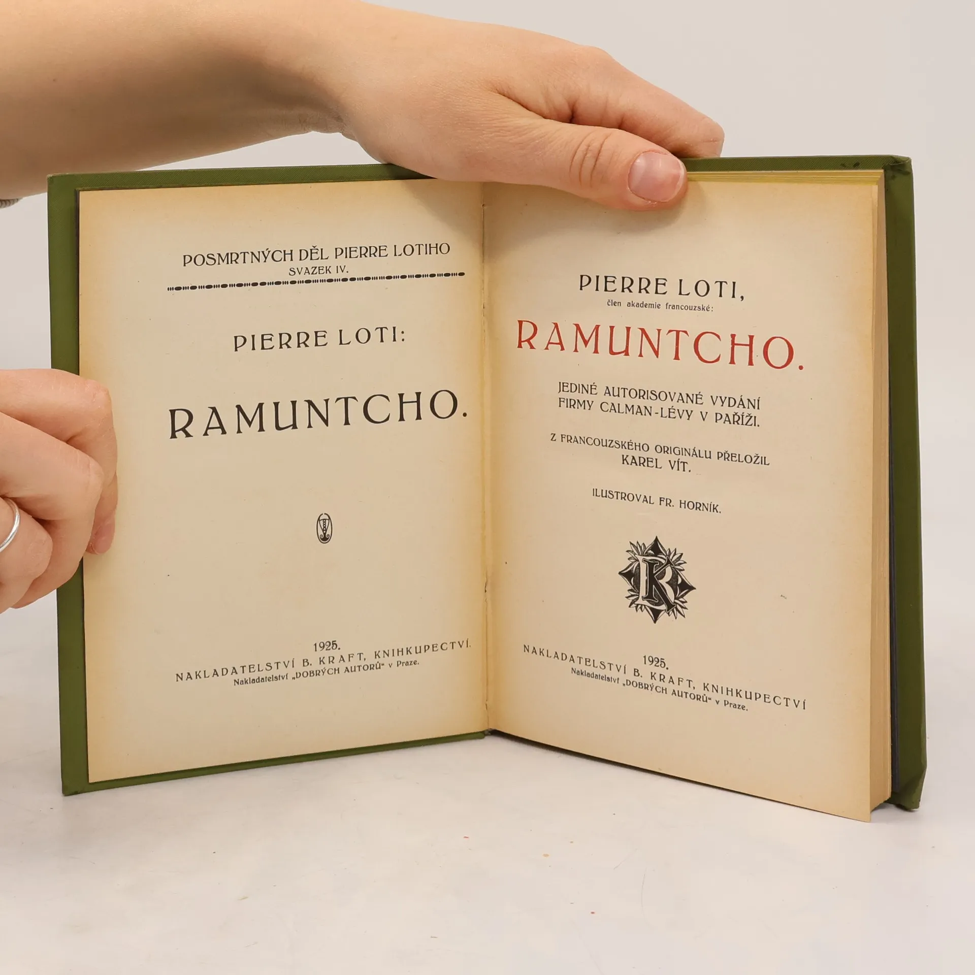 Pierre Loti, člen akademie francouzské: Ramuntcho. Jediné autorisované vydání firmy Calman - Lévy v Paříži. Z francouzského originálu přeložil Karel Vít. Ilustroval Fr. Horník. Nakladatelství B. Kraft, knihkupectví, Praha II. Nakladatelství "Dobrých autorů" v Praze. Edice: Posmrtná díla Pierre Lotiho, svazek IV. Tiskem Josefa Kolandy v Praze VIII., 1925 rok.