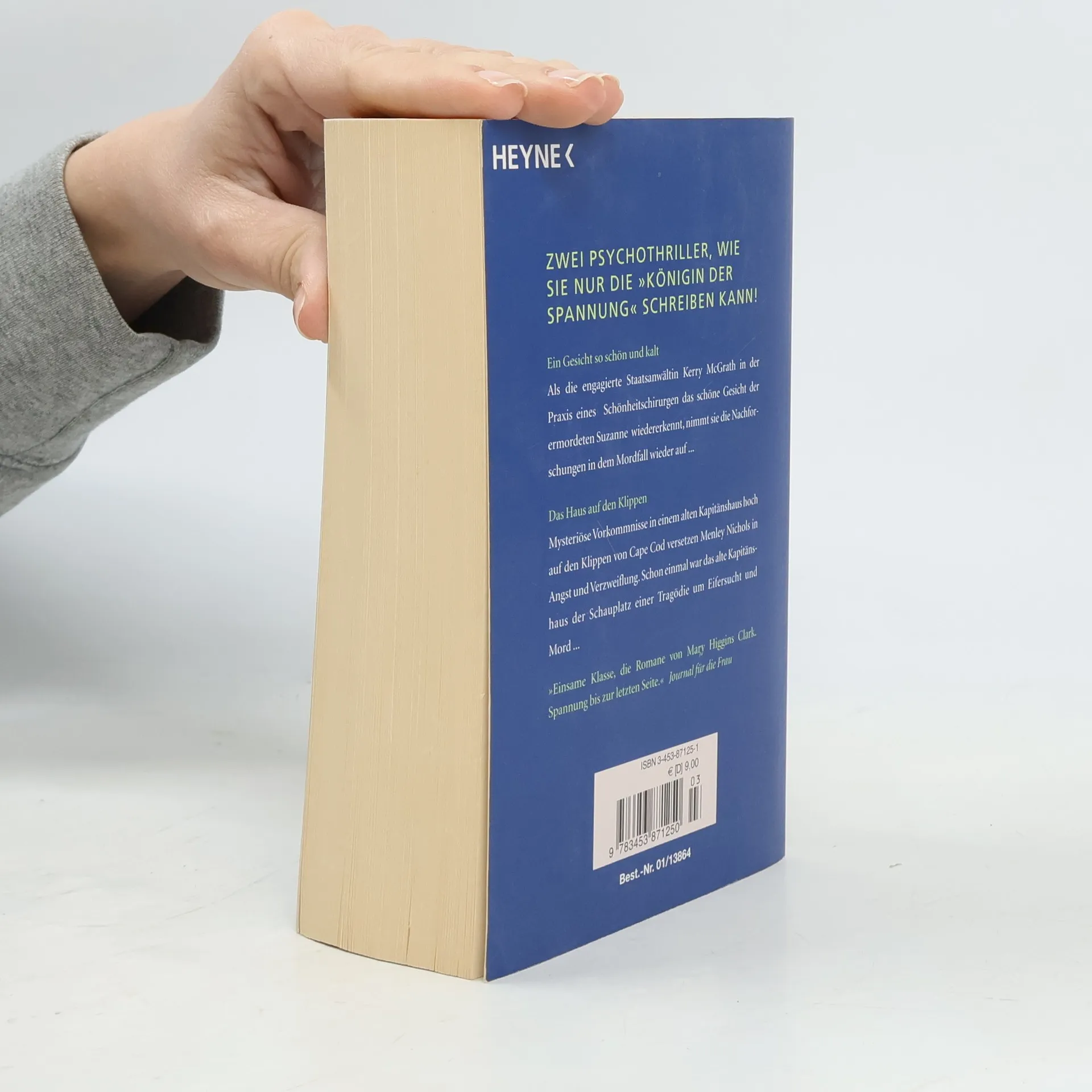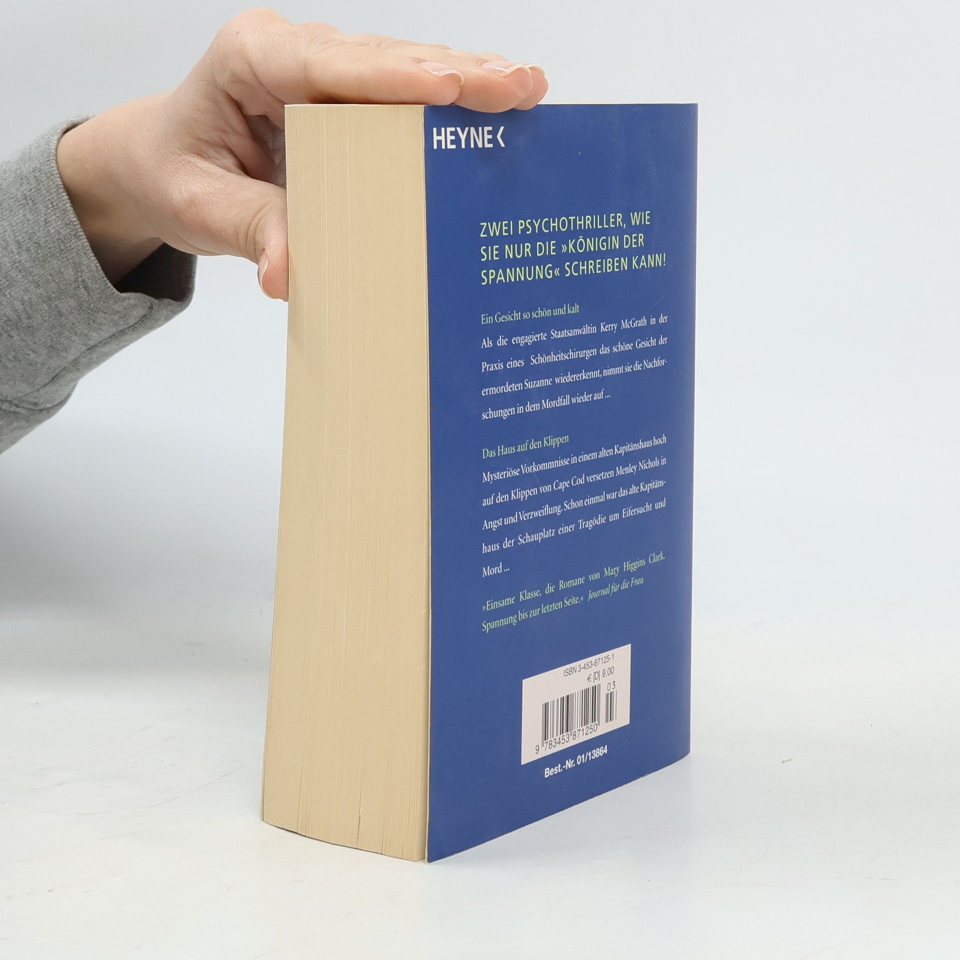 Als die Staatsanwältin Kerry McGrath in der Praxis eines renommierten Schönheitschirurgen das Gesicht der ermordeten Suzanne wiedererkennt, nimmt sie den Jahre zurückliegenden Fall wieder auf - und bringt eine auch für sie selbst gefährliche Lawine ins Rollen. Ein Psychothriller, wie nur die „Königin der Spannung“ ihn schreiben kann. Mysteriöse Vorkommnisse in einem alten Kapitänshaus, hoch über den Klippen von Cape Cod, versetzen die Schriftstellerin Menley Nichols in Angst und Verzweiflung. Das Haus war schon einmal Schauplatz einer Tragödie. „Die Bücher der “Königin der Spannung„ sind meisterhaft ausgeklügelte Thriller.“ HAMBURGER ABENDBLATT „Hoch spannend bis zum letzten Kapitel.“ DER STERN