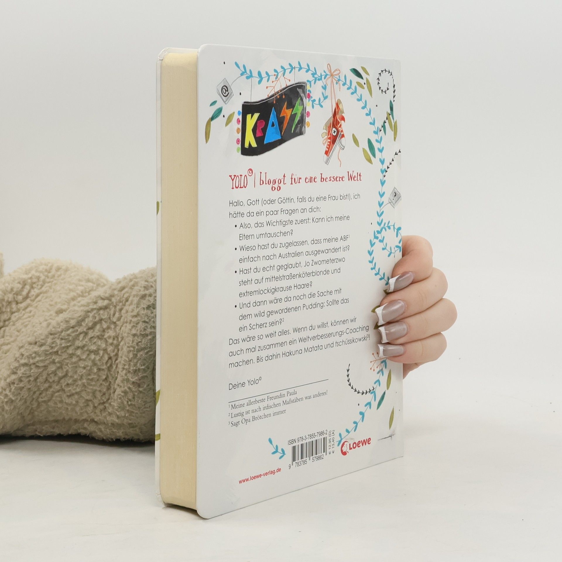 Yolo ist dreizehndreiviertel, einzige Tochter von geschiedenen Ernährungsberatern und mit der Gesamtsituation unzufrieden. Vor allem Erwachsenen fehlt einfach der Blick für das Wesentliche. Dabei ist doch völlig klar, dass Nuss-Nugat-Schokolade und Partys im KRASS zu den Grundrechten von Teenagern gehören! Yolo bloggt, um die Welt ein bisschen besser zu machen. Und zu einer besseren Welt gehört für Yolo auch, endlich von Jo Zwometerzwo beachtet zu werden – nur wie soll sie das am besten anstellen? Weltverbesserung aus der Sicht eines Teenagers: Ein frech und authentisch erzähltes Mädchenbuch mit witzigen Illustrationen zum Thema Bloggen, Freundschaft und erste Liebe.