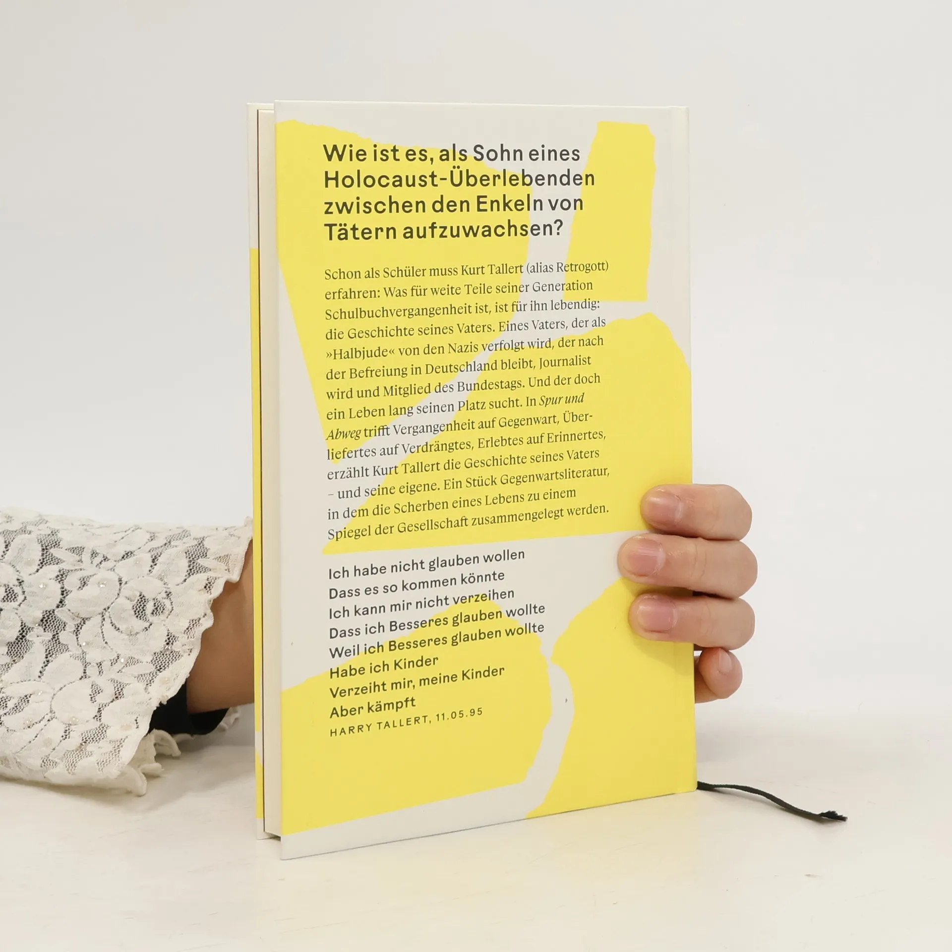 In ›Spur und Abweg‹ stellt Kurt Tallert sich der Verfolgungsgeschichte seiner Familie. Das Besondere an seinem Schicksal und seiner Perspektive auf die deutsche Geschichte: Kurt Tallert ist heute 37 Jahre alt, und doch wurde sein Vater als junger Mann noch von den Nazis als sogenannter Halbjude verfolgt. Bei der Geburt seines Sohnes ist Harry Tallert 58 Jahre alt. Und stirbt zwölf Jahre später. Was bleibt sind Erinnerungen, Notizen, Briefe, Fotos. Spuren eines beschädigten Lebens. Auf diesen Spuren wandelt Kurt Tallert. Sie führen ihn ins Bad Honnef seiner Kindheit, in zahllosen Regionalzügen quer durch die Republik und schließlich zu seiner jüdischen Urgroßmutter Berta – und zu der Frage: Was hat das eigentlich alles mit mir zu tun? Eine Liebeserklärung an einen traumatisierten Vater, sprachgewaltig, bewegend und radikal intim. Kurt Tallert führt uns vor Augen, dass Erinnern oder Vergessen nicht für alle Gegenstand einer Entscheidung ist.