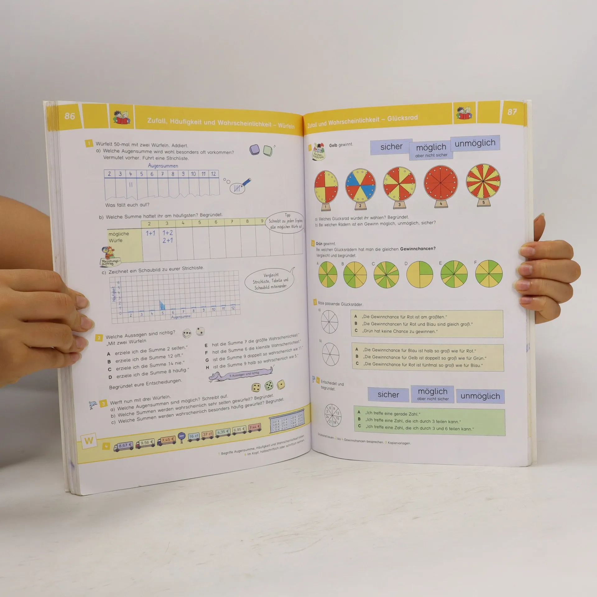 Denken und Rechnen - Schülerband 3 Übersichtliche, klar strukturierte Seiten, freche Illustrationen und kindgerechte Symbole laden ein zu einem modernen, kindgerechten Mathematikunterricht. Ein durchgängiges, leicht durchschaubares Differenzierungsprinzip vom Leichten zum Schwierigen und zusätzliche klar gekennzeichnete Differenzierungsangebote, erleichtern die Orientierung und unterstützen selbstständiges Lernen. Die Kinder können selbst geeignete Aufgaben auswählen und in ihrem Lerntempo bearbeiten. Das enorme Übungsangebot bietet eine gelungene Mischung aus „einfachen Aufgaben“ mit Übungseffekt und modernen Aufgabenformaten zum Entdecken, Erforschen und Weiterdenken. Auch Rechenkonferenzen und Partnerarbeit als kooperative Organisationsform, bei denen sich die Mathelerner austauschen können, haben ihren Platz. Wie ein „roter Faden“ ziehen sich die gelben Wiederholungsseiten und Wiederholungsabschnitte durch alle vier Schuljahre. Sie geben eine gute Orientierung, was die Kinder bereits können und liefern die Basis für den Einstieg in ein neues Thema.