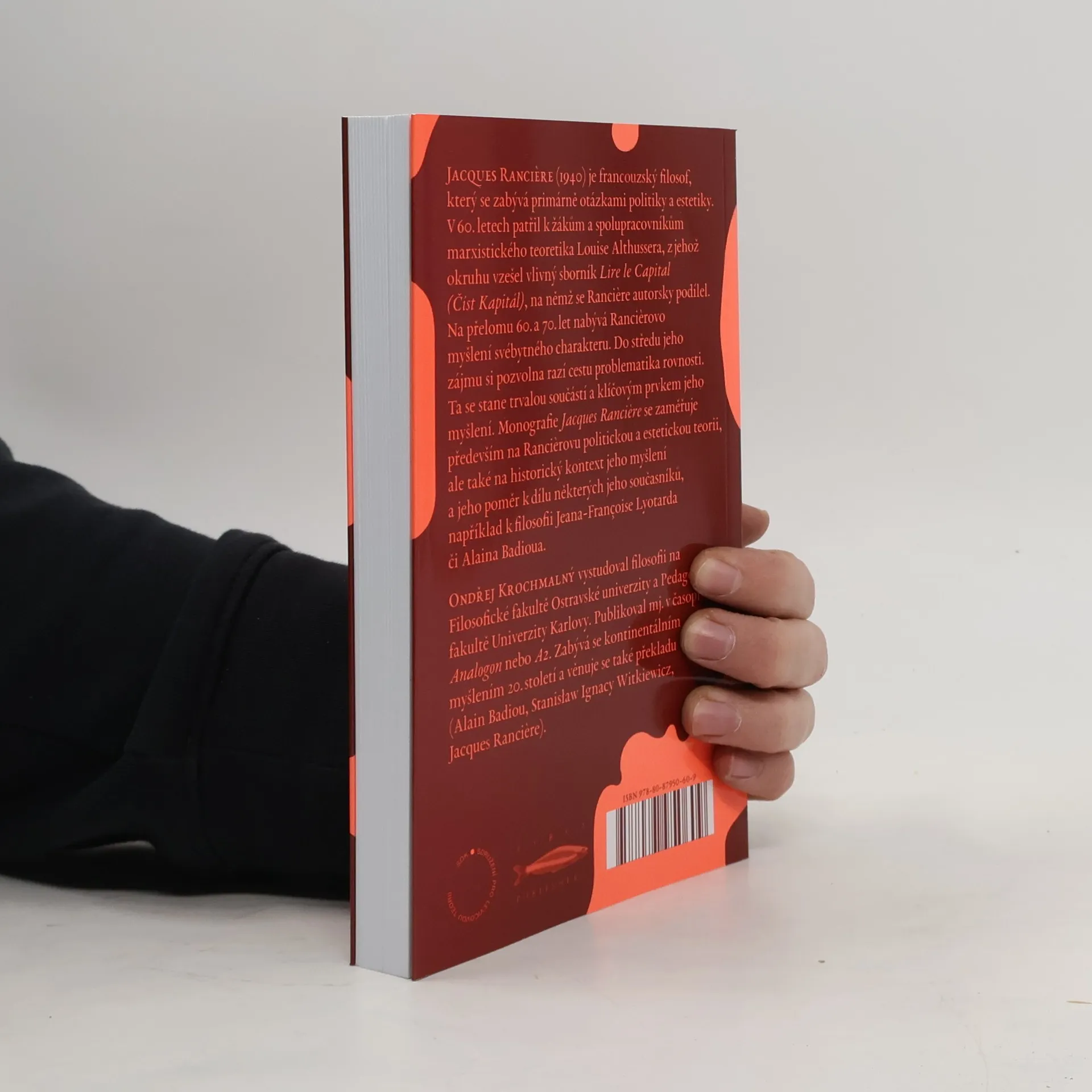 Jacques Ranciere (1940) je francouzsky filosof, který se zabývá primárně otázkami politiky a estetiky. V 60. letech patřil k žákům a spolupracovníkům marxistického teoretika Louise Althussera, z jehož okruhu vzešel vlivný sborník Lire le Capital (Číst Kapitál), na němž se Ranciere autorsky podílel. Na přelomu 60. a 70. let nabývá Rancierovo myšlení svébytného charakteru. Do středu jeho zájmu si pozvolna razí cestu problematika rovnosti. Ta se stane trvalou součástí a klíčovým prvkem jeho myšlení. Monografie Jacques Ranciere se zaměřuje především na Rancierovu politickou a estetickou teorii, ale také na historický kontext jeho myšlení a jeho poměr k dílu některých jeho současníků, například k filosofii Jeana-Françoise Lyotarda či Alaina Badioua.