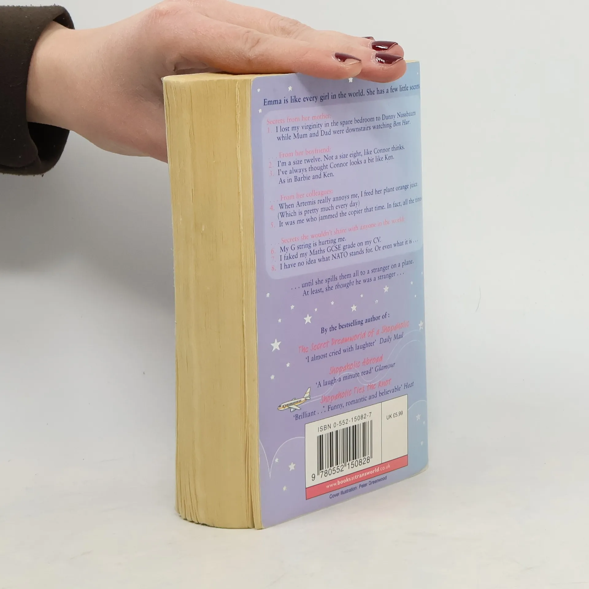 Emma is like every girl in the world. She has a few little secrets. I lost my virginity in the spare bedroom to Danny Nussbaum while Mum and Dad were downstairs watching Ben Hur. I'm a size twelve. Not a size eight, like Connor thinks. I've always thought Connor looks a bit like Ken. As in Barbie and Ken. When Artemis really annoys me, I feed her plant orange juice. (Which is pretty much every day). It was me who jammed the copier that time. In fart, all the times. My G string is hurting me. I faked my Maths GCSE grade on my CV. I have no idea what NATO stands for. Or even what it is... ... until she spills them all to a stranger on a plane. At least, she thought he was a stranger...