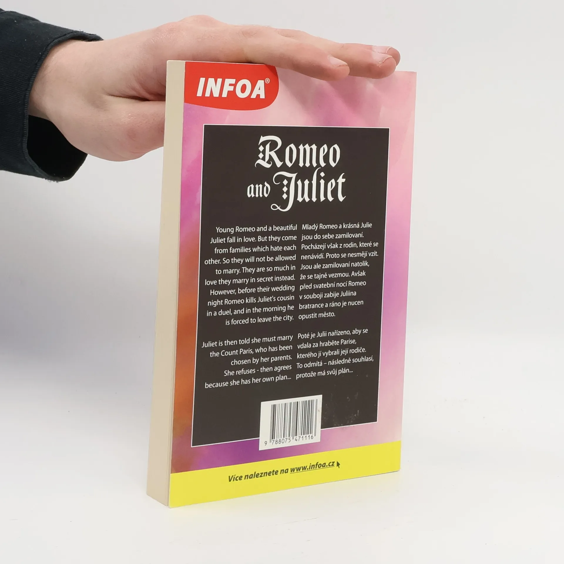 Podle příběhu Williama Shakespeara. Souběžný český text. Určeno pro mírně pokročilé. Mladý Romeo a krásná Julie jsou do sebe zamilovaní. Pocházejí však z rodin, které se nenávidí. Proto se nesmějí vzít. Jsou ale zamilovaní natolik, že se tajně vezmou. Avšak před svatební nocí Romeo v souboji zabije Juliina bratrance a ráno je nucen opustit město. Poté je Julii nařízeno, aby se vdala za hraběte Parise, kterého jí vybrali její rodiče. To odmítá – následně souhlasí, protože má svůj plán...
