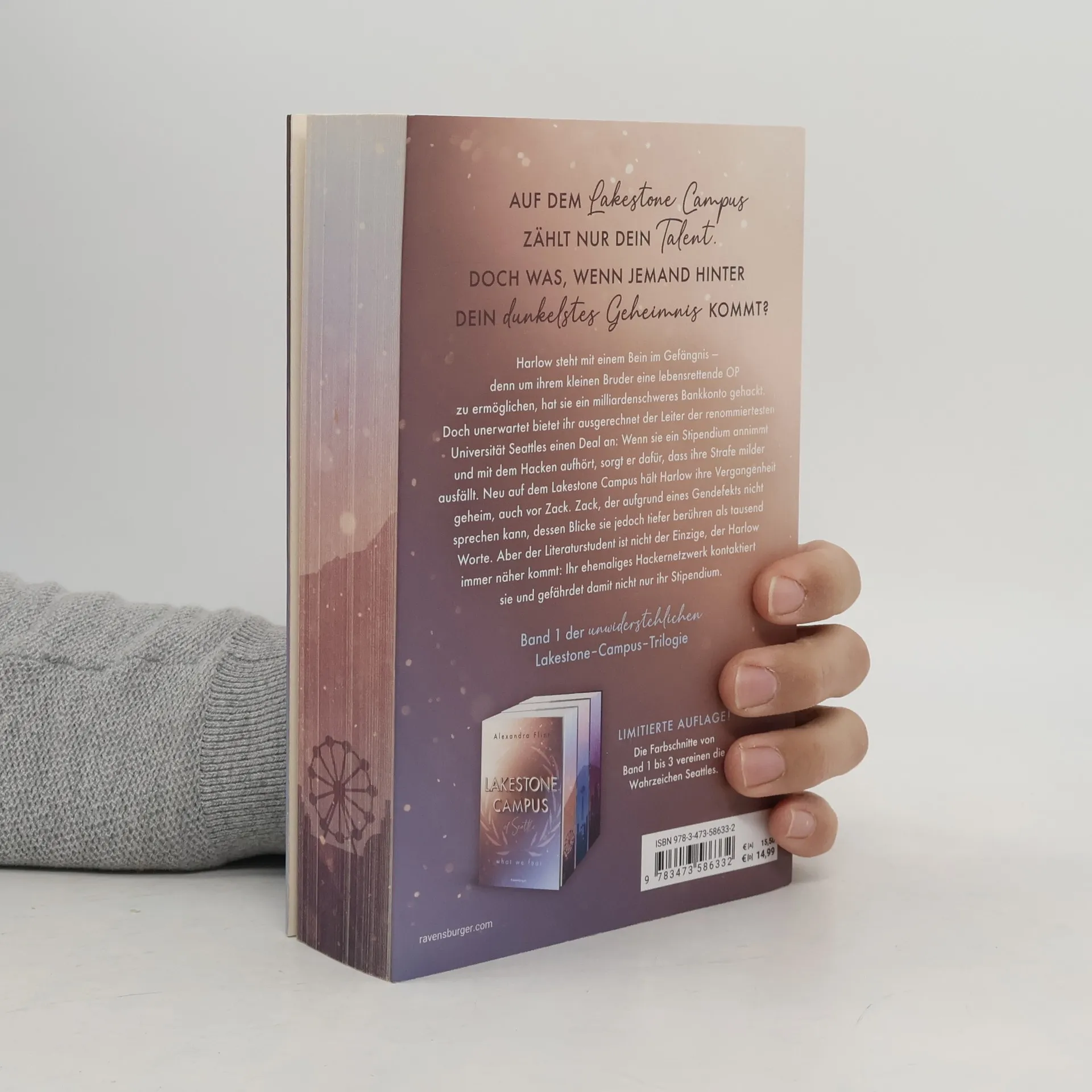 ***Limitierte Auflage mit farbigem Buchschnitt und Charakterkarte! Nur solange der Vorrat reicht!*** Harlow steht mit einem Bein im Gefängnis – denn um ihrem kleinen Bruder eine lebensrettende OP zu ermöglichen, hat sie ein milliardenschweres Bankkonto gehackt. Doch unerwartet bietet ihr der Leiter des Lakestone Campus in Seattle ein Stipendium und Sozialstunden an. Neu an der Uni hält Harlow ihre Vergangenheit geheim. Auch vor dem Literaturstudenten Zack, der aufgrund eines Gendefekts nicht sprechen kann. Aber nicht nur er kommt Harlow immer näher, sondern auch ihr ehemaliges Hackernetzwerk. Mitreißend. Knisternd. Unwiderstehlich. Band 1 der neuen New-Adult-Trilogie von SPIEGEL-Bestsellerautorin Alexandra Flint. Die Bücher der Lakestone-Campus-Reihe: Band 1: What We Fear Band 2: What We Lost (erscheint im Herbst 2024) Band 3: What We Hide (erscheint im Frühjahr 2025) Weitere knisternde New-Adult-Romance der Autorin bei Ravensburger: Maple-Creek-Dilogie Band 1: Meet Me in Maple Creek Band 2: Save Me in Maple Creek