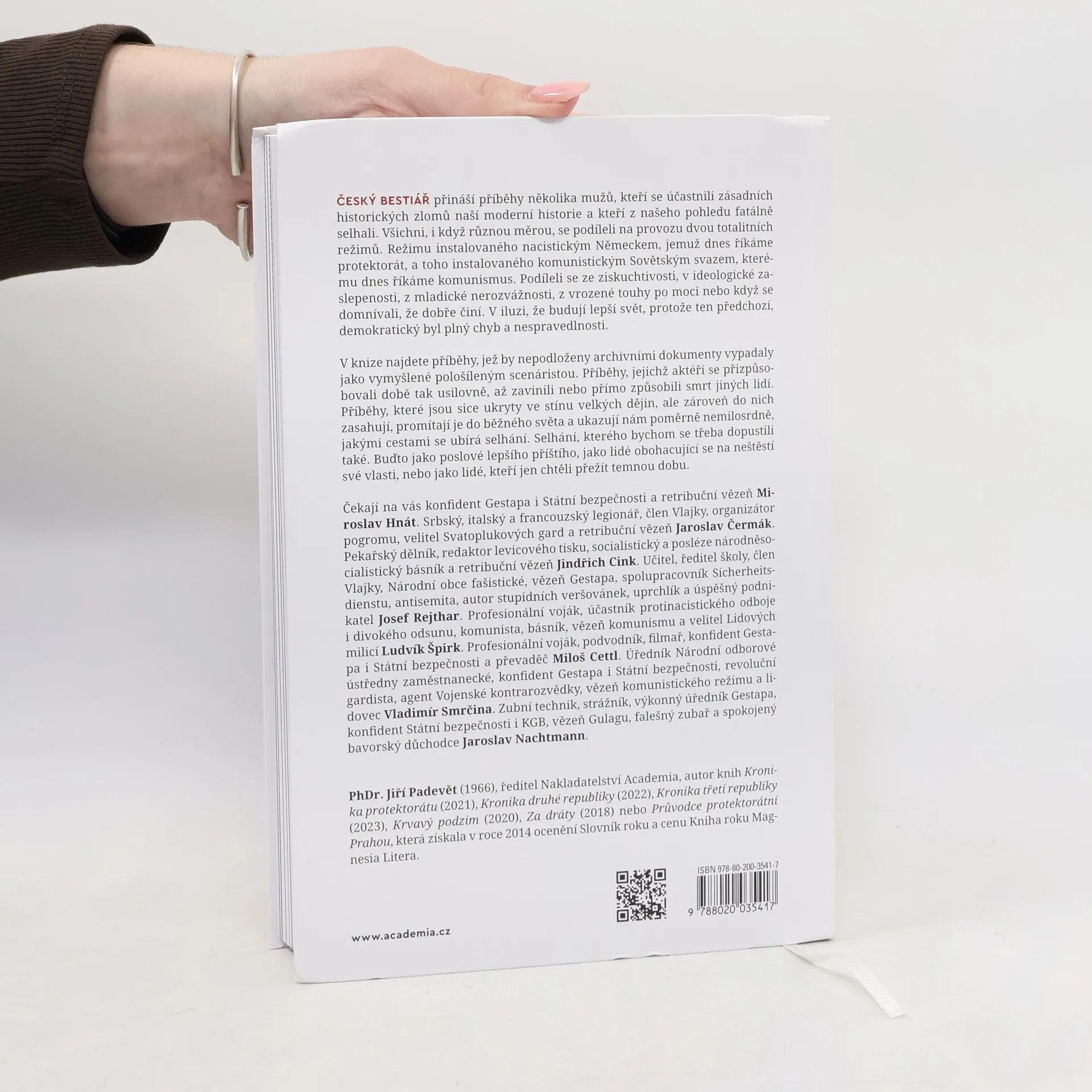 Český bestiář přináší příběhy několika mužů, kteří se účastnili zásadních historických zlomů naší moderní historie a kteří z našeho pohledu fatálně selhali. Všichni, i když různou měrou, se podíleli na provozu dvou totalitních režimů. Režimu instalovaného nacistickým Německem, jemuž dnes říkáme protektorát, a toho instalovaného komunistickým Sovětským svazem, kterému dnes říkáme komunismus. Podíleli se ze ziskuchtivosti, v ideologické zaslepenosti, z mladické nerozvážnosti, z vrozené touhy po moci nebo když se domnívali, že dobře činí. V iluzi, že budují lepší svět, protože ten předchozí, demokratický byl plný chyb a nespravedlnosti. V knize najdete příběhy, jež by nepodloženy archivními dokumenty vypadaly jako vymyšlené pološíleným scenáristou. Příběhy, jejichž aktéři se přizpůsobovali době tak usilovně, až zavinili, nebo přímo způsobili smrt jiných lidí. Příběhy, které jsou sice ukryty ve stínu velkých dějin, ale zároveň do nich zasahují, promítají je do běžného světa a ukazují nám poměrně nemilosrdně, jakými cestami se ubírá selhání. Selhání, kterého bychom se třeba dopustili také. Buďto jako poslové lepšího příštího, jako lidé obohacující se na neštěstí své vlasti, nebo jako lidé, kteří jen chtěli přežít temnou dobu.