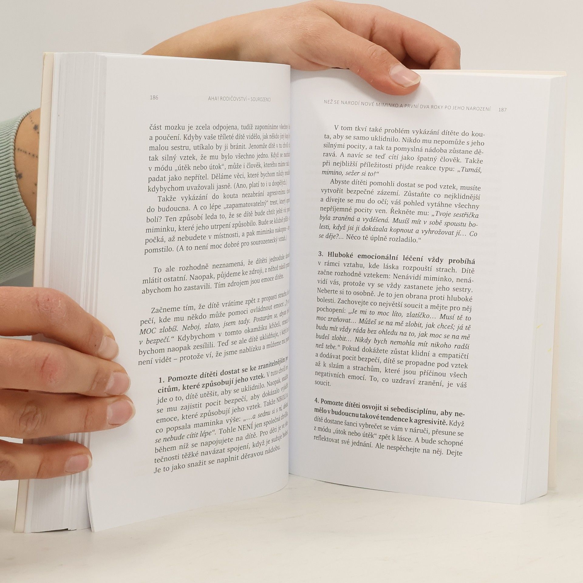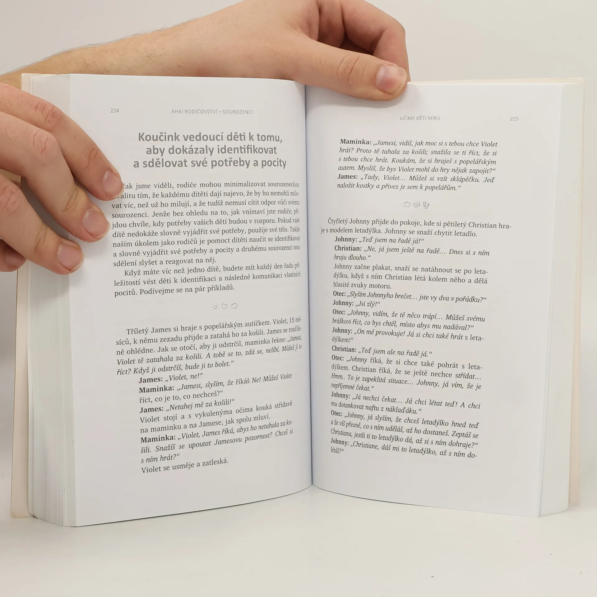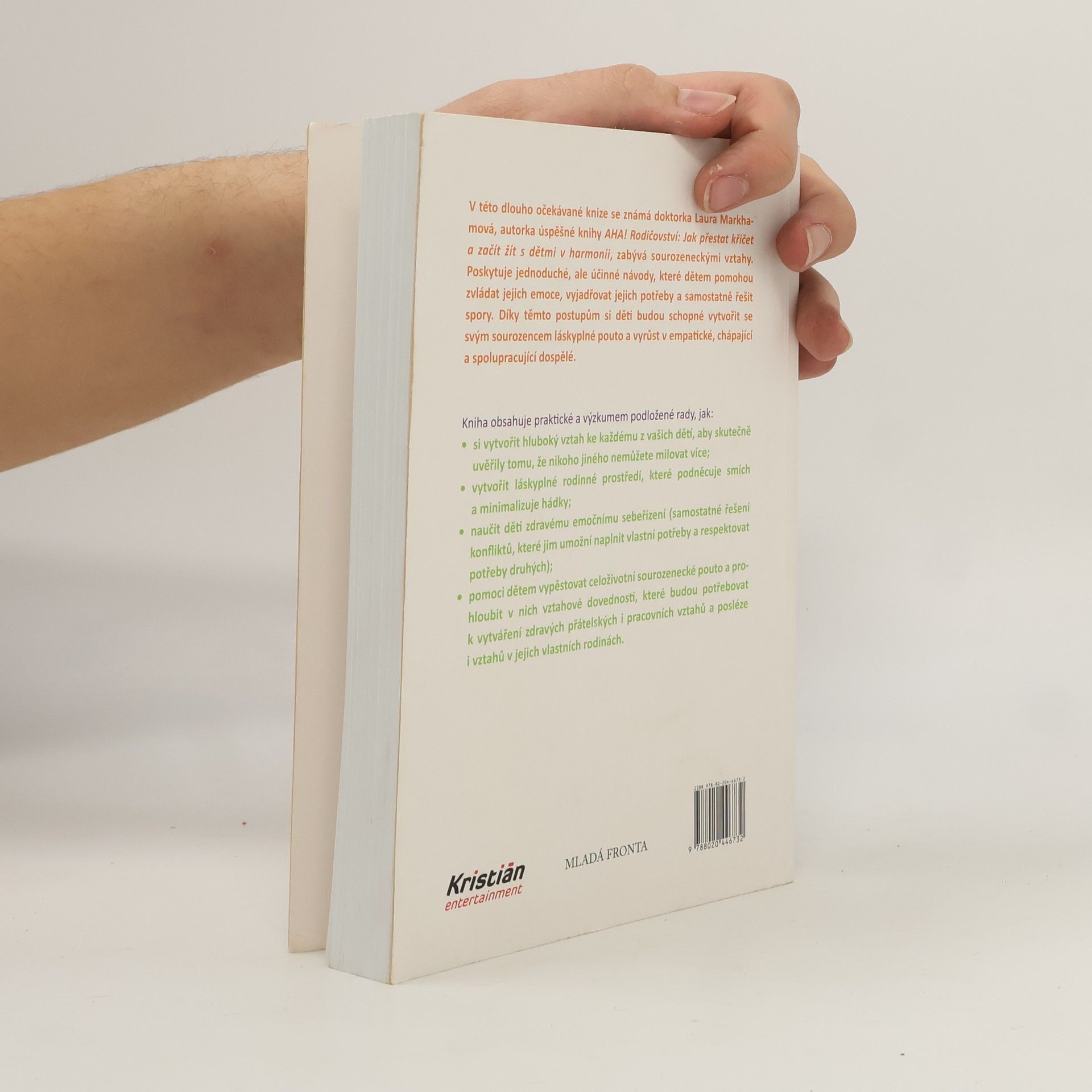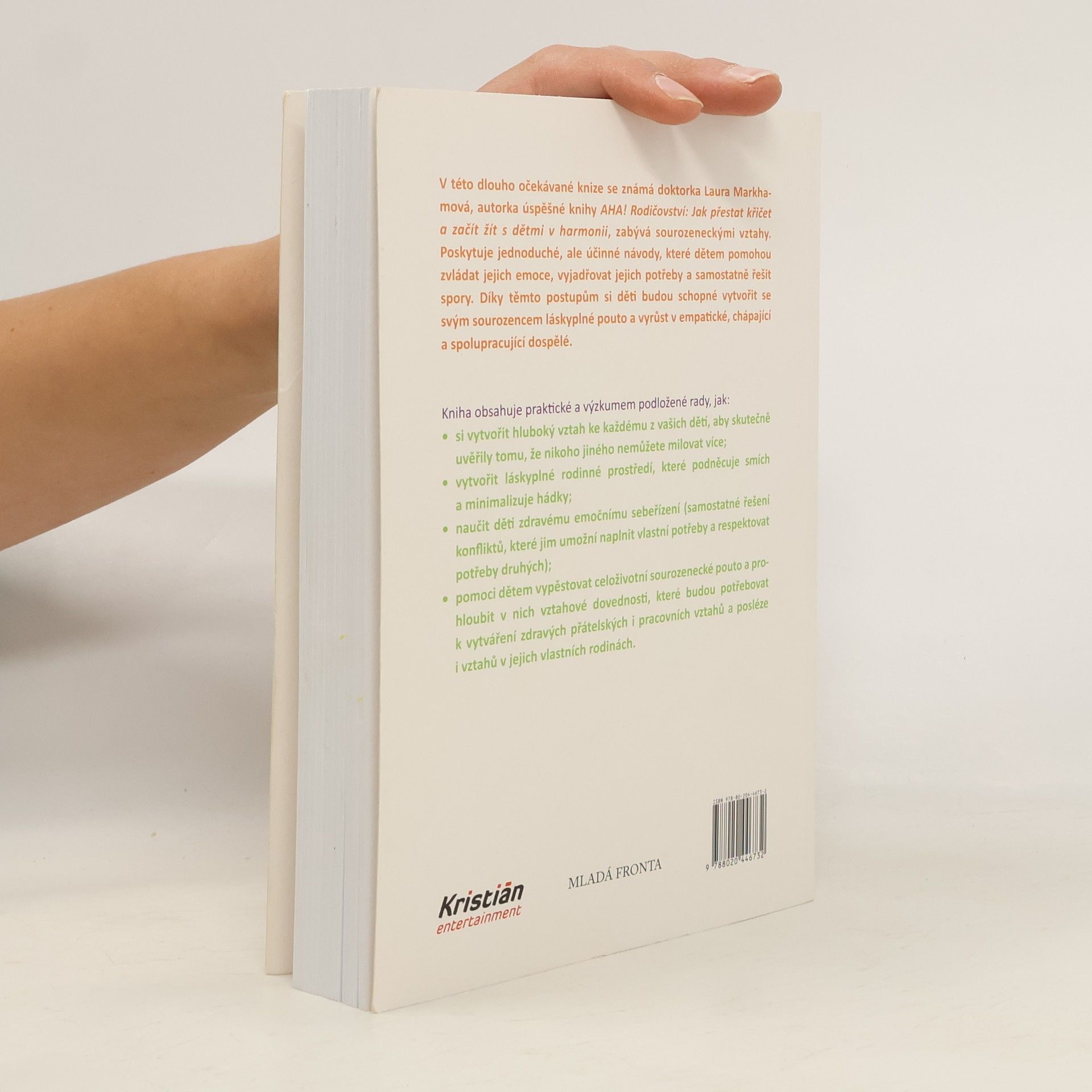 Jak zabránit sporům mezi sourozenci a vychovat z nich přátele na celý život. V této dlouho očekávané knize se známá doktorka Laura Markhamová, autorka úspěšné knihy AHA! Rodičovství: Jak přestat křičet a začít s dětmi žít v harmonii, zabývá sourozeneckými vztahy. Poskytuje jednoduché, ale účinné návody, které dětem pomohou zvládat jejich emoce, vyjadřovat jejich potřeby a samostatně řešit spory. Díky těmto postupům si děti budou schopné vytvořit se svým sourozencem láskyplné pouto a vyrůst v empatické, chápající a spolupracující dospělé. Kniha obsahuje praktické a výzkumem podložené rady, jak: - si vytvořit hluboký vztah ke každému z vašich dětí, aby skutečně uvěřily tomu, že nikoho jiného nemůžete milovat více; - vytvořit láskyplné rodinné prostředí, které podněcuje smích a minimalizuje hádky; - naučit děti zdravému emočnímu sebeřízení (samostatné řešení konfliktů, které jim umožní naplnit vlastní potřeby a respektovat potřeby druhých); - pomoci dětem vypěstovat celoživotní sourozenecké pouto a prohloubit v nich vztahové dovednosti, které budou potřebovat k vytváření zdravých přátelských i pracovních vztahů a posléze i vztahů v jejich vlastních rodinách.