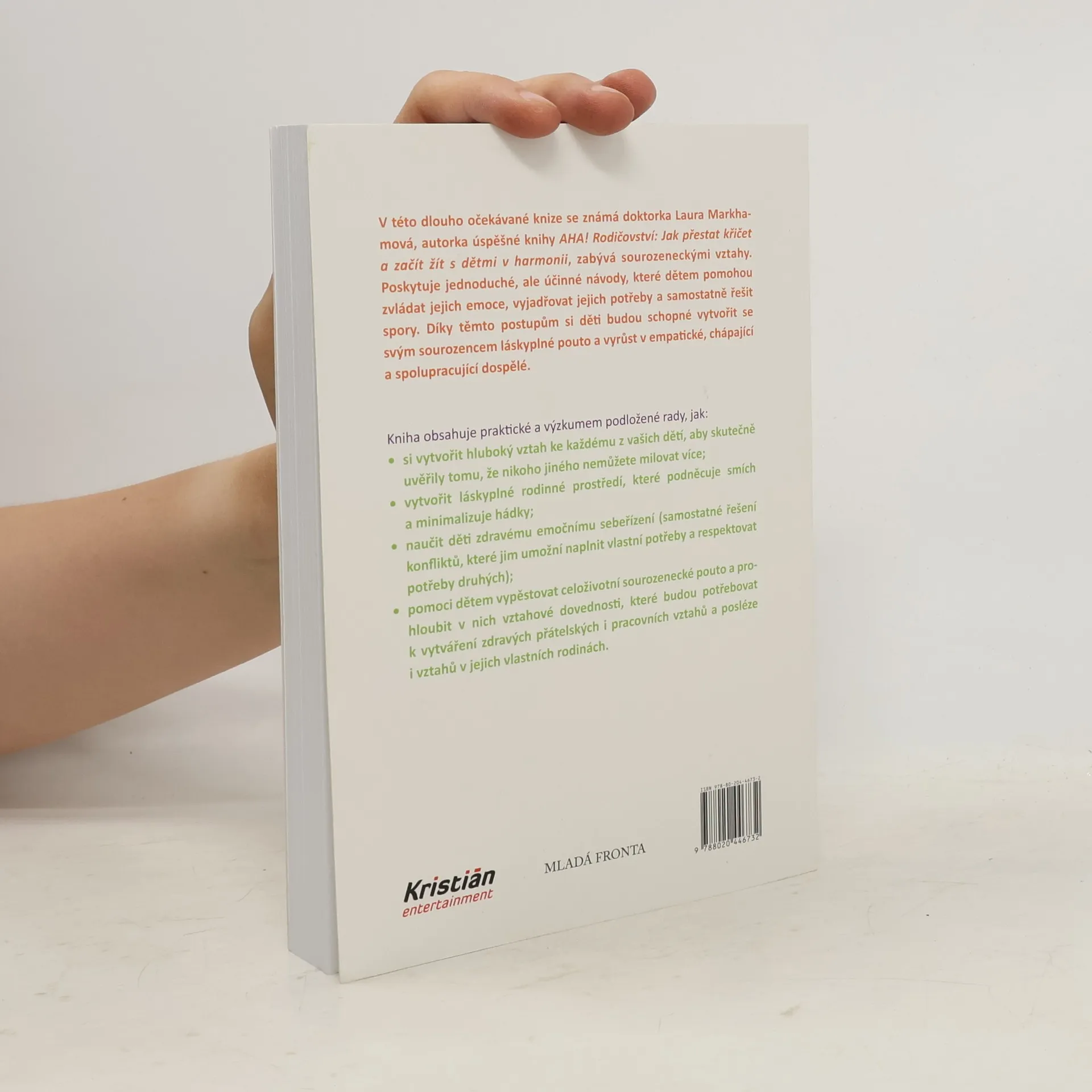Jak zabránit sporům mezi sourozenci a vychovat z nich přátele na celý život. V této dlouho očekávané knize se známá doktorka Laura Markhamová, autorka úspěšné knihy AHA! Rodičovství: Jak přestat křičet a začít s dětmi žít v harmonii, zabývá sourozeneckými vztahy. Poskytuje jednoduché, ale účinné návody, které dětem pomohou zvládat jejich emoce, vyjadřovat jejich potřeby a samostatně řešit spory. Díky těmto postupům si děti budou schopné vytvořit se svým sourozencem láskyplné pouto a vyrůst v empatické, chápající a spolupracující dospělé. Kniha obsahuje praktické a výzkumem podložené rady, jak: - si vytvořit hluboký vztah ke každému z vašich dětí, aby skutečně uvěřily tomu, že nikoho jiného nemůžete milovat více; - vytvořit láskyplné rodinné prostředí, které podněcuje smích a minimalizuje hádky; - naučit děti zdravému emočnímu sebeřízení (samostatné řešení konfliktů, které jim umožní naplnit vlastní potřeby a respektovat potřeby druhých); - pomoci dětem vypěstovat celoživotní sourozenecké pouto a prohloubit v nich vztahové dovednosti, které budou potřebovat k vytváření zdravých přátelských i pracovních vztahů a posléze i vztahů v jejich vlastních rodinách.