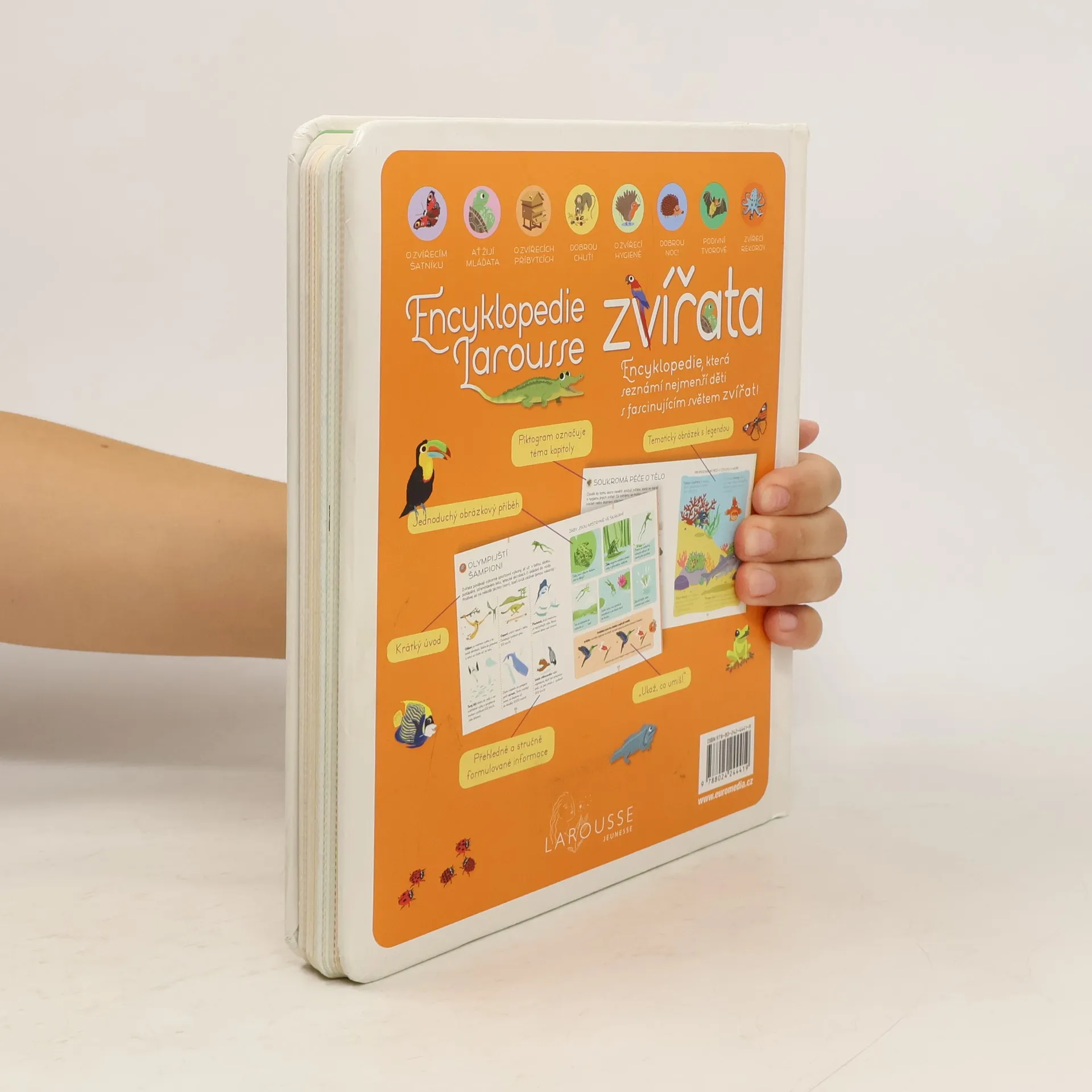 Encyklopedie pro nejmenší hravou a zábavnou formou seznamuje ty nejmenší s rozmanitostí světa zvířat. Tematicky rozčleněné kapitoly zahrnují vzhled rozmanitých živočichů, jejich zvyky, stravu, výchovu mláďat, výskyt i způsob života. Bohaté ilustrace a jednoduché obrázkové příběhy usnadňují dětem pochopení a knihu zpestřují mimo jiné zábavné úkoly a zajímavosti.