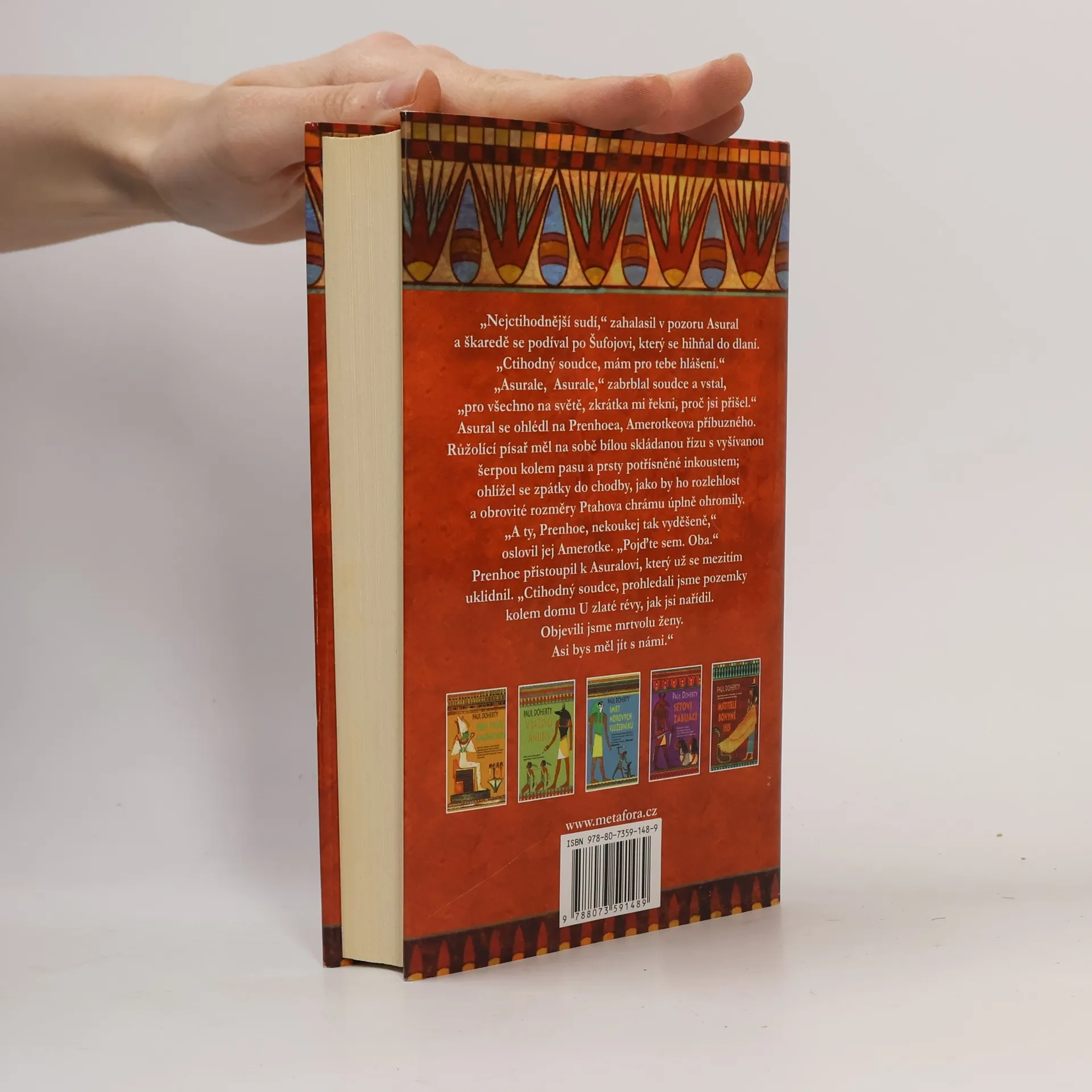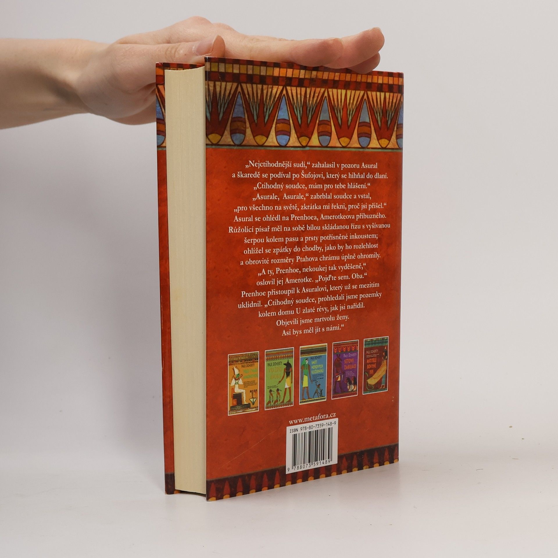 Záhadný zločinec rozsévá smrt po celých Thébách… Další napínavý případ oblíbeného soudce Amerotkea… Posvátný obřad na nádvoří Ptahova chrámu je v plném proudu, když vtom tři písaři padnou k zemi. Na první pohled je jasné, že jejich smrt má na svědomí jed. Královna-faraon Hatusu rozkáže svému nejvyššímu soudci Amerotkeovi odhalit viníka. Smrt významného obchodníka a jeho ženy, které najdou utopené v jezírku, s tím zdánlivě nijak nesouvisí, ale na světlo začnou vyplouvat nečekané skutečnosti. Co s tím vším mají společného dávné Knihy zkázy a koho vlastně hledají všechny zločinecké bandy v Thébách? To všechno musí vyřešit Zrak i sluch Božské, královský soudce Amerotke.