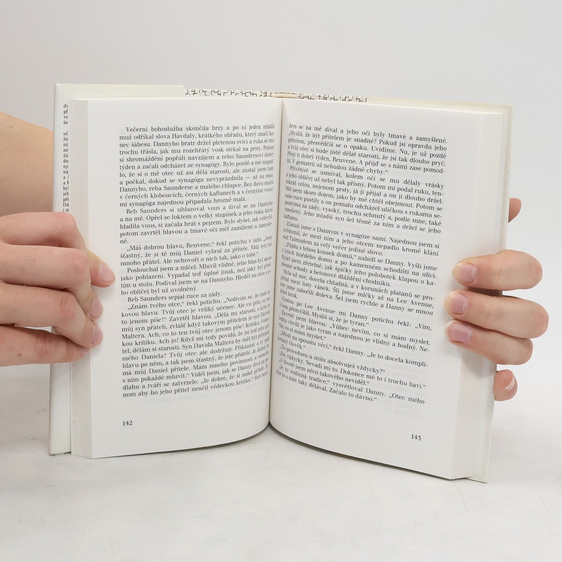 Nebezpečný úraz ve škole spřátelí dva chlapce, z nichž jeden je z tolerantní židovské rodiny s moderním přístupem k náboženství a druhý je z rodiny ortodoxních Chasidů, jež lpí fanaticky na židovských tradicích. Jsme svědky vzpoury chlapce proti uzavřenému náboženskému a myšlenkovému světu, ale i zvláštní moudrosti jeho ortodoxního otce, pramenící z hlubin zkušeností jeho národa. Do příběhu zasahují politické reálie této doby, zvláště vznik státu Izrael. Druhý díl této knihy se jmenuje Slib. Působivý příběh o přátelství dvou chlapců se odehrává v exotickém prostředí ortodoxní židovské komunity New Yorku 40. let.