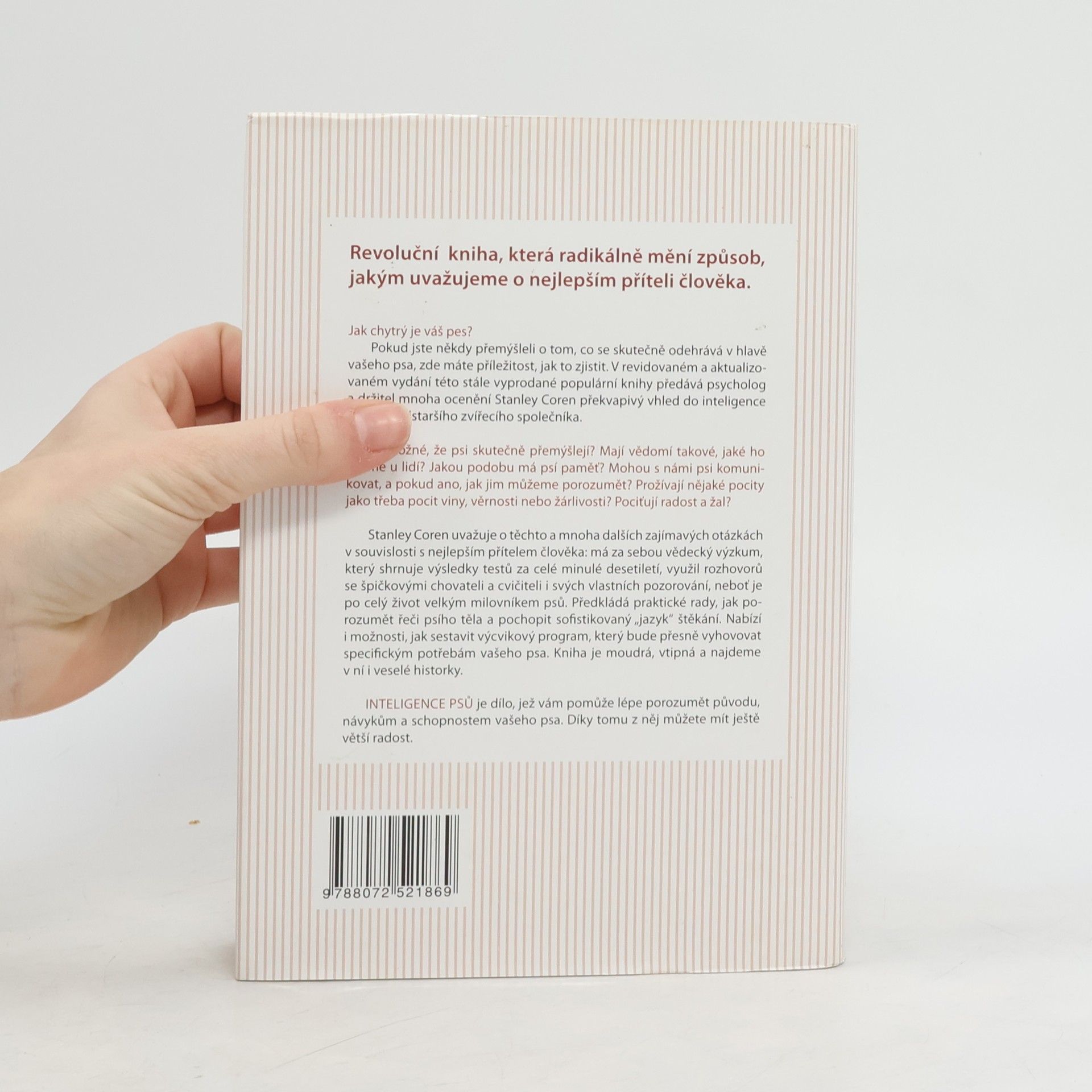 Stočtyřicet století se člověk a pes svorně dělí o potravu, obydlí, radosti i starosti. Co však o svých nejlepších přátelích vlastně víme? Monografie se snaží odpovědět na nejčastější otázky, které jste si jistě někdy položili i sami. Přemýšlejí psi? Pokud psi přemýšlejí, mají vědomí, které je srovnatelné s lidským vnímáním? Mají psi vzpomínky na věci minulé a dovedou si představit i věci budoucí? Rozumějí psi lidské řeči? Mají psi systém či prostředky ke komunikaci s námi nebo s jinými psi? Liší se jednotlivá plemena psů v tom, co bychom mohli nazvat inteligencí? Znají psi pocity, jako je například vina, věrnost, ochranářství, emoce jako je kupříkladu radost nebo žal? Přestože na mnohé z těchto otázek si vnímavý majitel na základě vlastní zkušenosti se psem odpoví sám, tato kniha nabízí podrobnější, odborně naučné odpovědi, doložené řadou konkrétních příkladů a zajímavých příběhů