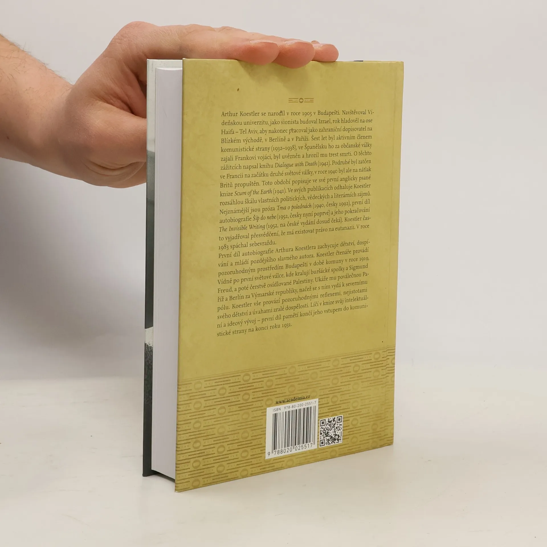 První svazek autobiografie: 1905-1931. První díl autobiografie Arthura Koestlera zachycuje dětství, dospívání a mládí pozdějšího slavného autora. Koestler čtenáře provádí pozoruhodnými prostředím Budapešti v době Komuny v roce 1919, Vídně po první světové válce, kde kralují buršácké spolky a Sigmund Freud, a poté čerstvě osídlované Palestiny. Ukáže mu poválečnou Paříž a Berlín za Výmarské republiky, načež se s ním vydá k severnímu pólu. Koestler vše provází pozoruhodnými reflexemi, nejistotami svého dětství a úvahami zralé dospělosti. Líčí v knize svůj intelektuální a ideový vývoj - první díl pamětí končí jeho vstupem do komunistické strany na konci roku 1931.