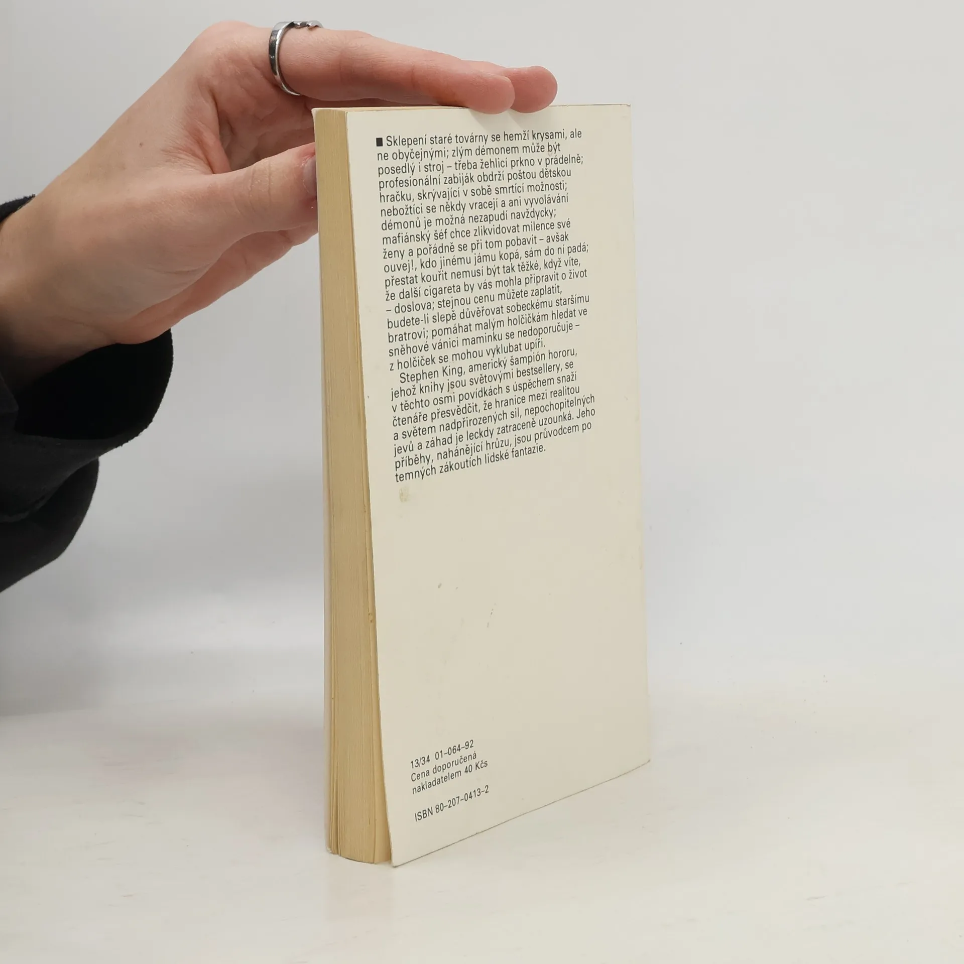 Sklepení staré továrny se hemží krysami, ale ne obyčejnými; zlým démonem může být posedlý i stroj – třeba žehlící prkno v prádelně; profesionální zabiják obdrží poštou dětskou hračku, skrývající v sobě smrtící možnosti; nebožtíci se někdy vracejí a ani vyvolávání démonů je možná nezapudí navždycky; mafiánský šéf chce zlikvidovat milence své ženy a pořádně se při tom pobavit – avšak ouvej!, kdo jinému jámu kopá, sám do ní padá; přestat kouřit nemusí být tak těžké, když víte, že další cigareta by vás mohla připravit o život – doslova; stejnou cenu můžete zaplatit, budete-li slepě důvěřovat sobeckému staršímu bratrovi; pomáhat malým holčičkám hledat ve sněhové vánici maminku se nedoporučuje. Stephen King, americký šampión moderního hororu, jehož knihy jsou světovými bestsellery, se v těchto osmi povídkách s úspěchem snaží čtenáře přesvědčit, že hranice mezi realitou a světem nadpřirozených sil, nepochopitelných jevů a záhad je leckdy zatraceně uzounká. Jeho příběhy, nahánějící hrůzu, jsou průvodce po temných zákoutí lidské fantazie. Přeložil Pavel Medek.