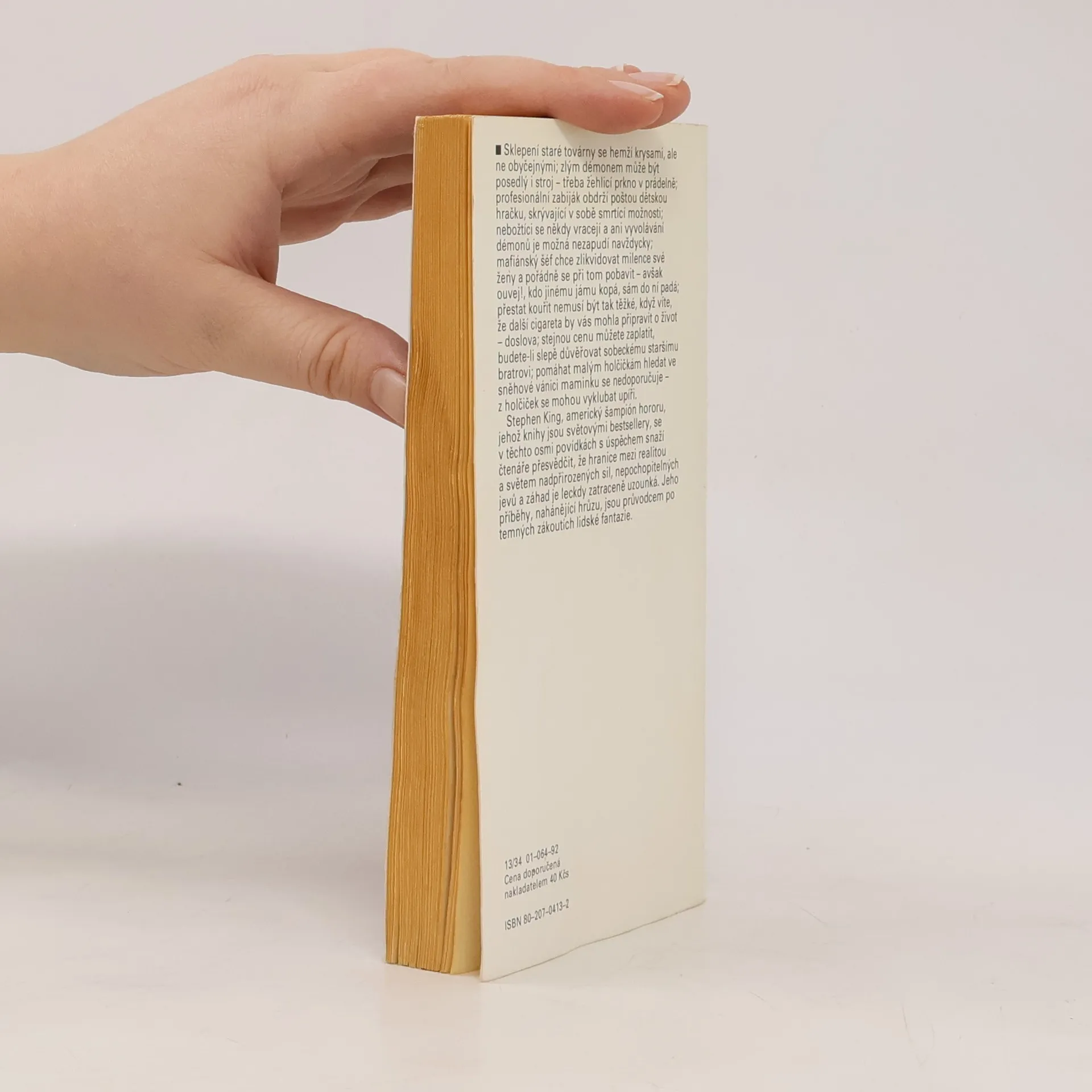 Sklepení staré továrny se hemží krysami, ale ne obyčejnými; zlým démonem může být posedlý i stroj – třeba žehlící prkno v prádelně; profesionální zabiják obdrží poštou dětskou hračku, skrývající v sobě smrtící možnosti; nebožtíci se někdy vracejí a ani vyvolávání démonů je možná nezapudí navždycky; mafiánský šéf chce zlikvidovat milence své ženy a pořádně se při tom pobavit – avšak ouvej!, kdo jinému jámu kopá, sám do ní padá; přestat kouřit nemusí být tak těžké, když víte, že další cigareta by vás mohla připravit o život – doslova; stejnou cenu můžete zaplatit, budete-li slepě důvěřovat sobeckému staršímu bratrovi; pomáhat malým holčičkám hledat ve sněhové vánici maminku se nedoporučuje. Stephen King, americký šampión moderního hororu, jehož knihy jsou světovými bestsellery, se v těchto osmi povídkách s úspěchem snaží čtenáře přesvědčit, že hranice mezi realitou a světem nadpřirozených sil, nepochopitelných jevů a záhad je leckdy zatraceně uzounká. Jeho příběhy, nahánějící hrůzu, jsou průvodce po temných zákoutí lidské fantazie. Přeložil Pavel Medek.