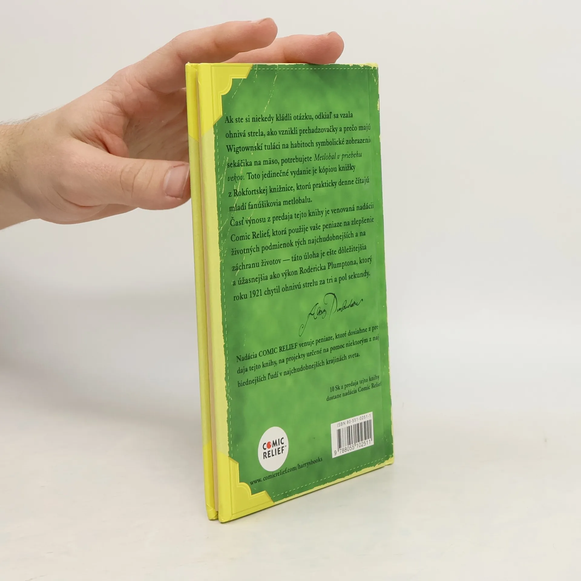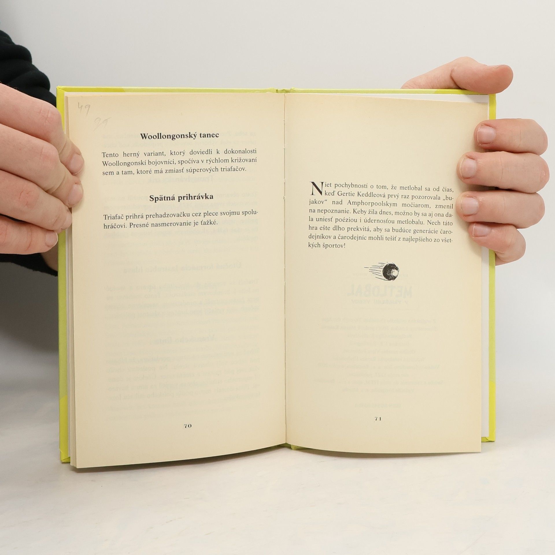 Toto jedinečné vydanie je kópiou knižky z Rokfordskej knižnice, ktorú prakticky denne čítajú mladí fanúšikovia metlolabu. Ak ste si niekedy kládli otázku, odkiaľ sa vzala ohnivá strela, ako vznikli prehadzovačky a prečo majú Wigtownskí tuláci na habitoch symbolické zobrazenie sekáčika na mäso, potrebujete túto knižku. Časť výnosu z predaja tejto knižky je venovaná nadácii Comic Relief, ktorá použije vaše peniaze na zlepšenie životných podmienok tých najchudobnejších a na záchranu životov - táto úloha je ešte dôležitejšia a úžasnejšia ako výkon RoderickaPlumptona, ktorý roku 1921 chytil ohnivú guľu za tri a pol sekundy. Upozornenie: Kniha je veľmi vhodná pre tých čitateľov, ktorí trpia úplne neškodnou závislosťou na čitaní príbehov o mladom čarodajníkovi Harrym Potterovi.