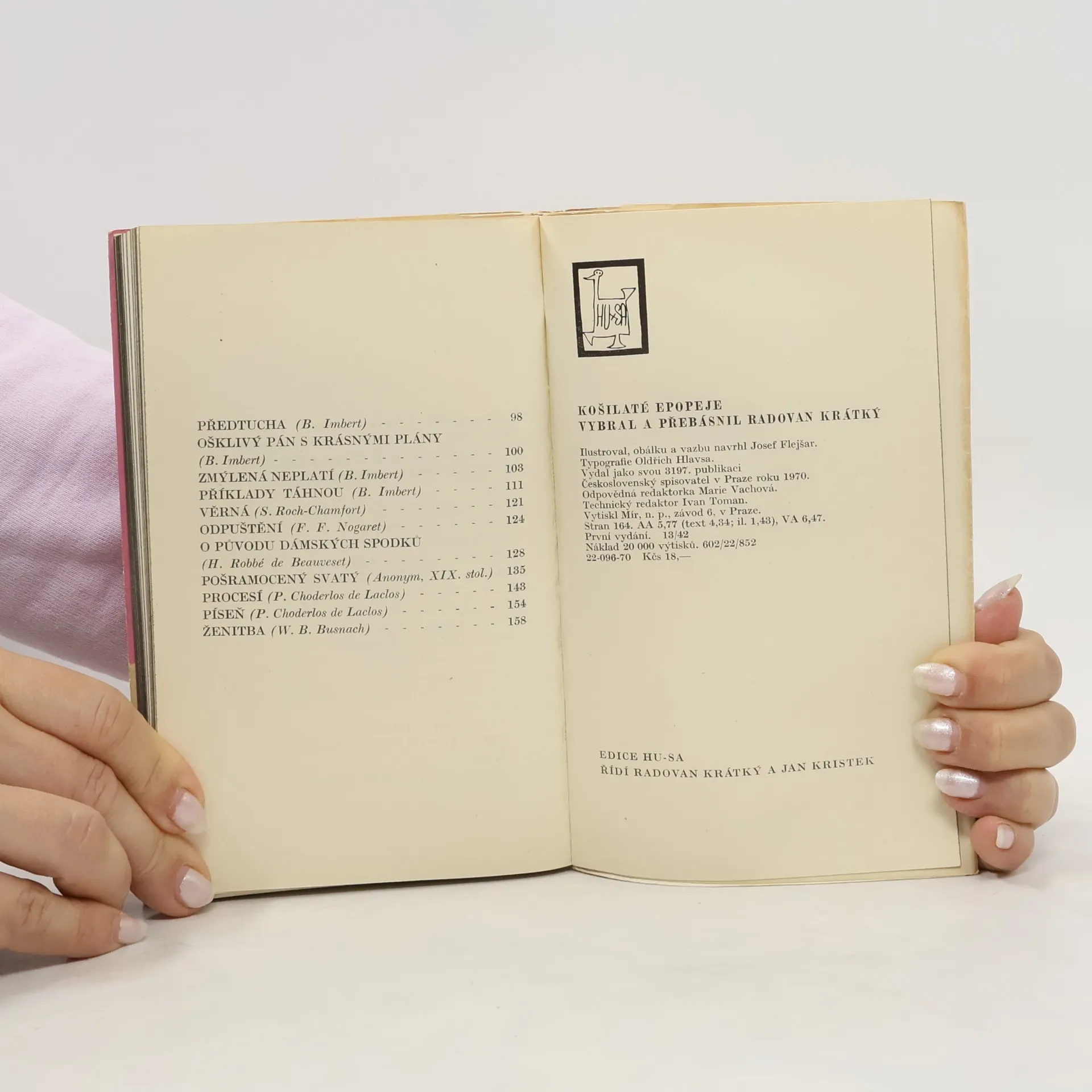 Výbor z děl francouzských básníků 17. a 18. století (např. Grécourt, La Fontaine, Voltaire, Nogaret, Imbert, Choderlos de Laclos) a ojediněle i 19. století se zaměřuje na rozměrnější básně anekdotického rázu — na básnické povídky, jejichž námětem je rozvernost, milostnost a především duchaplnost. Výbor, který nezahrnuje překlady, nýbrž přebásnění a který navazuje na sbírku Galantní poezie, je knihou půvabnou, veselou a zábavnou. 22-096-70