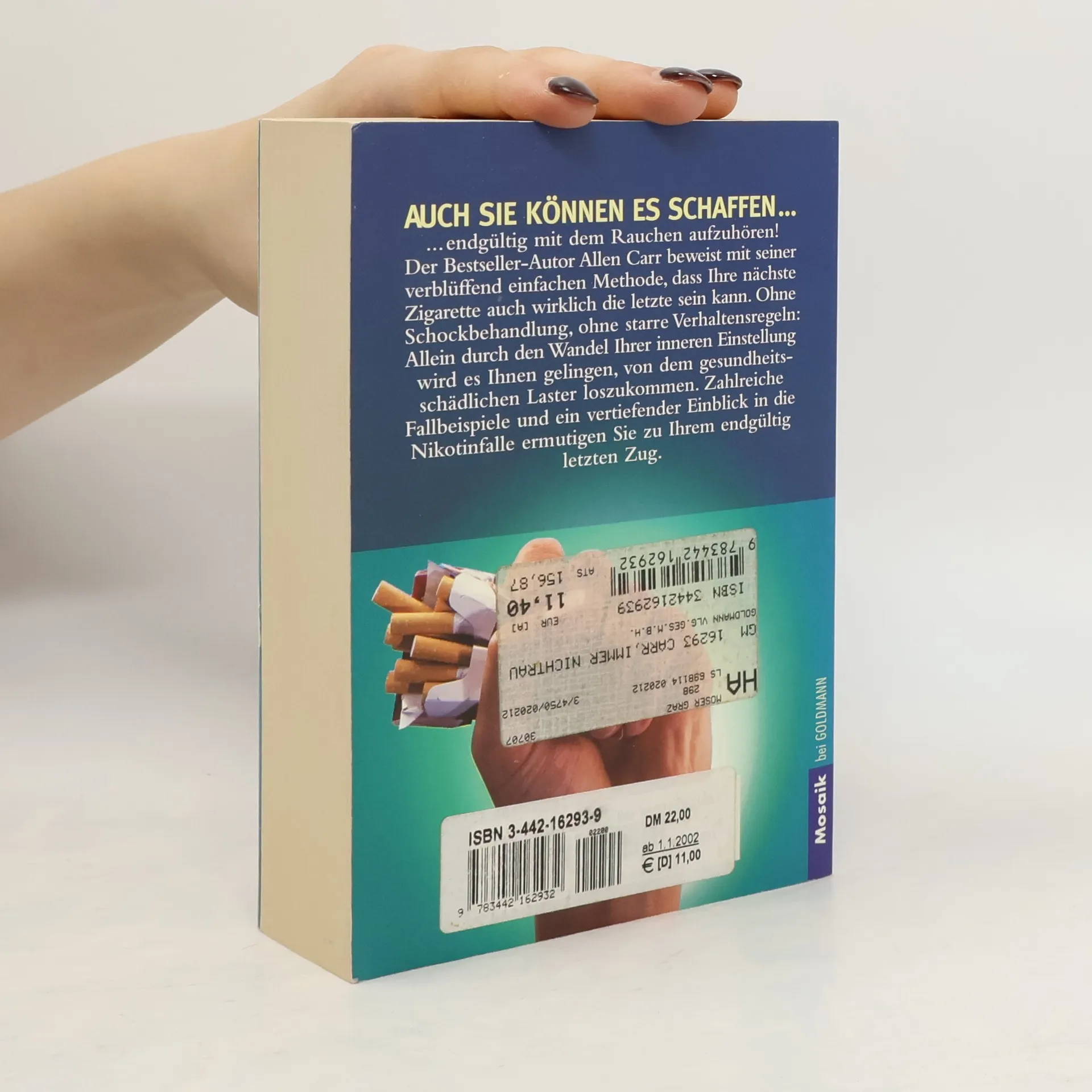 Schluß mit dem Rauchen! - mit diesem Buch kann jeder endlich den lang gehegten Vorsatz in die Tat umsetzen. Allen Carr zeigt eine verblüffend einfache Methode, mit der die nächste Zigarette wirklich zur letzten wird. Und das ohne Schockbehandlung und ohne starre Verhaltensregeln: Allein durch einen Wandel der inneren Einstellung gelingt es, dauerhaft mit dem Rauchen aufzuhören. Der ausführliche, psychologisch fundierte Ratgeber ist der Schlüssel zu einem gesunden und glücklichen Leben als Nichtraucher. Mit dieser erfolgreichen Methode, die bereits weltweit unzählige Anhänger gefunden hat, kann es endlich jeder schaffen.