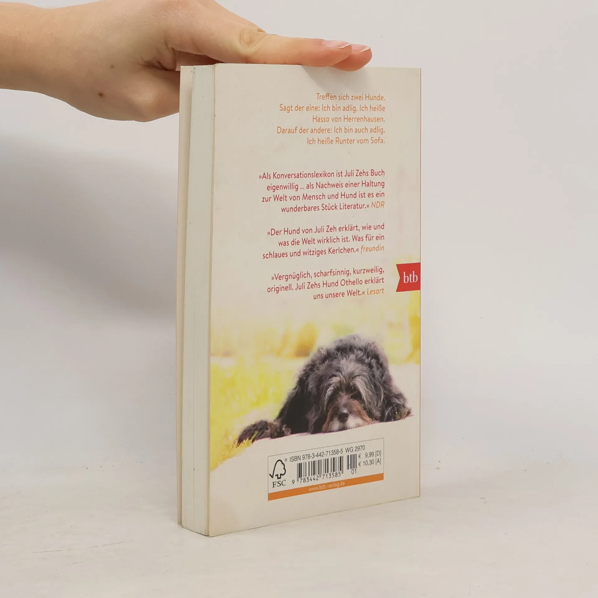 Das Hundeversteherbuch für jeden Zweibeiner. Beherrscht ein Hund einen soliden Grundstock an Vokabeln, verhindert das Missverständnisse und erleichtert das Zusammenleben von Haushund und Homo sapiens enorm. In diesem Buch erklärt Othello, der Hund von Juli Zeh, der sich auf umfangreiche Recherchen stützen kann, auf seine unvergleichlich großmäulige und extrem geistreiche Art die Welt, wie sie wirklich ist … Ausstattung: zahlreiche Farbfotos