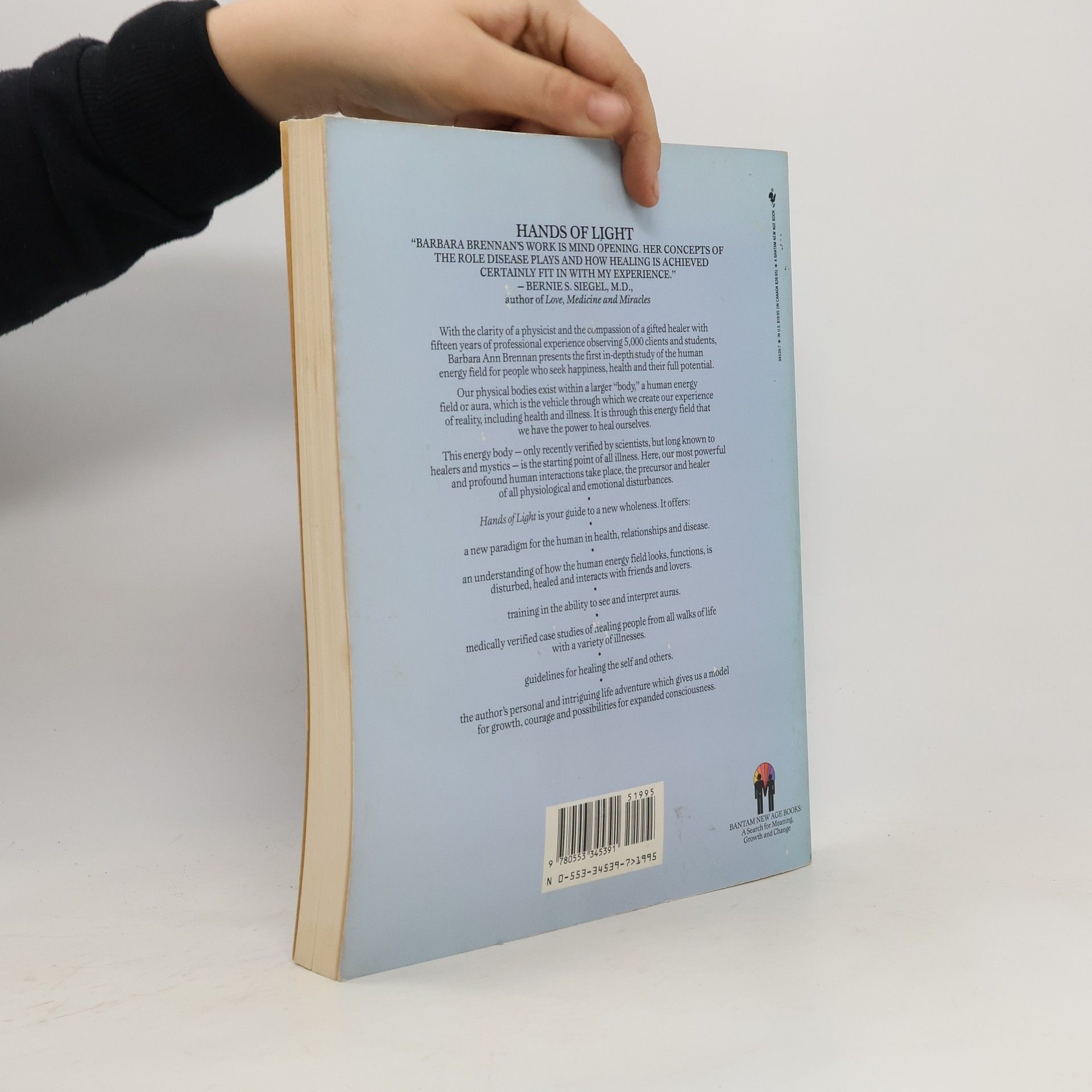 With the clarity of a physicist and the compassion of a gifted healer with fifteen years of professional experience observing 5,000 clients and students, Barbara Ann Brennan presents the first in-depth study of the human energy field for people who seek happiness, health and their full potential. Our physical bodies exist within a larger "body," a human energy field or aura, which is the vehicle through which we create our experience of reality, including health and illness. It is through this energy field that we have the power to heal ourselves. This energy body -- only recently verified by scientists, but long known to healers and mystics -- is the starting point of all illness. Here, our most powerful and profound human interactions take place, the precursor and healer of all physiological and emotional disturbances. Hands of Light is your guide to a new wholeness. It offers: • A new paradigm for the human, in health, relationship, and disease • An understanding of how the human energy field looks, functions, is disturbed, healed, and interacts with friends and lovers. • Training in the ability to see and interpret auras • Medically verified case studies of healing people from all walks of life with a variety of illnesses. • Guidelines for healing the self and others. • The author's personal and intriguing life adventure which gives us a model for growth, courage and possibilities for expanded consciousness