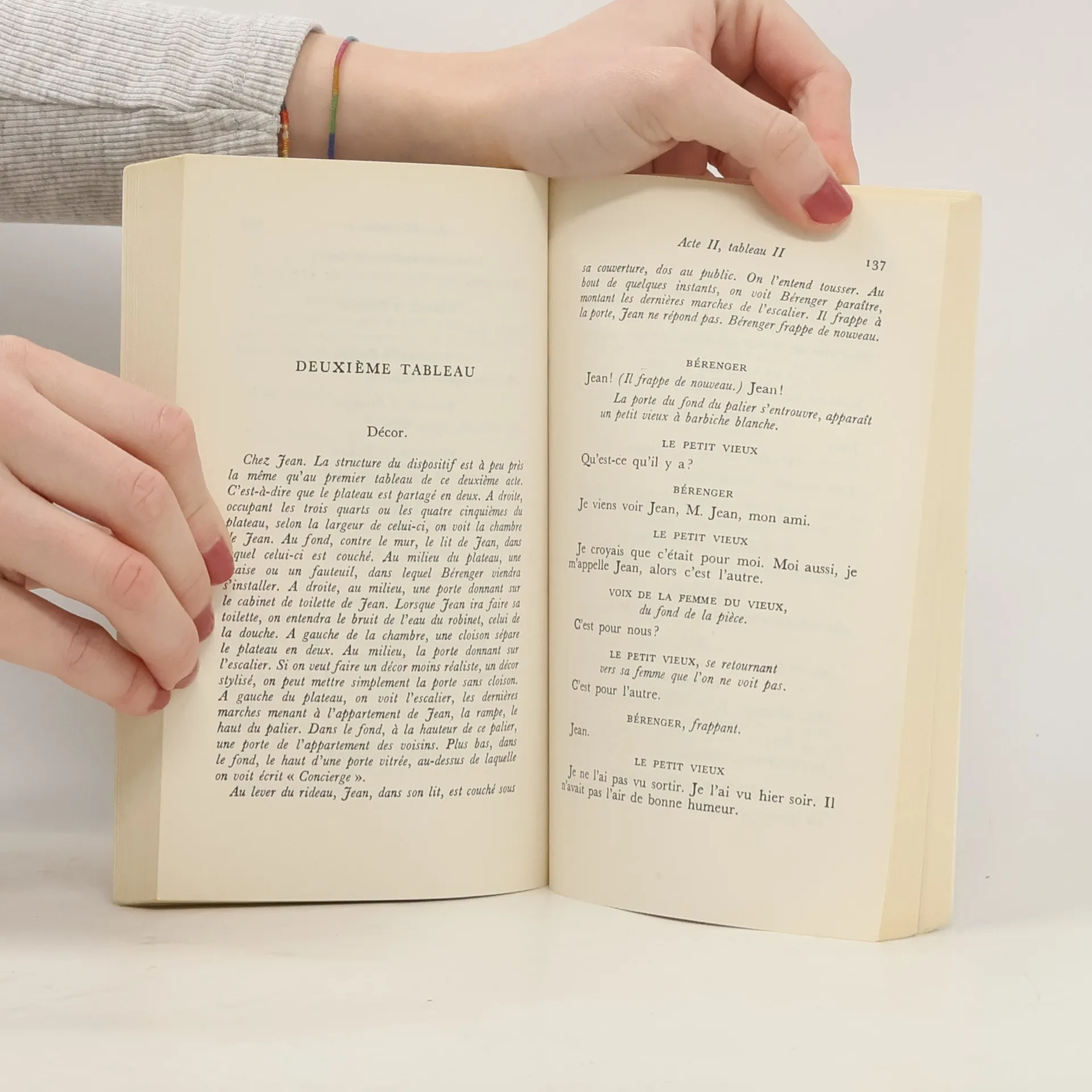 Ce sont eux qui sont beaux. J'ai eu tort! Oh! Comme je voudrais être comme eux. Je n'ai pas de corne, hélas! Que c'est laid, un front plat. Il m'en faudrait une ou deux, pour rehausser mes traits tombants. Ca viendra peut-être, et je n'aurai plus honte, je pourrai aller tous les retrouver. Mais ça ne pousse pas! (Il regarde les paumes de ses mains.) Mes mains sont moites. Deviendront-elles rugueuses? (Il enlève son veston, défait sa chemise, contemple sa poitrine dans la glace.) J'ai la peau flasque. Ah, ce corps trop blanc, et poilu! Comme je voudrais avoir une peau dure et cette magnifique couleur d'un vert sombre, une nudité décente, sans poils, comme la leur!