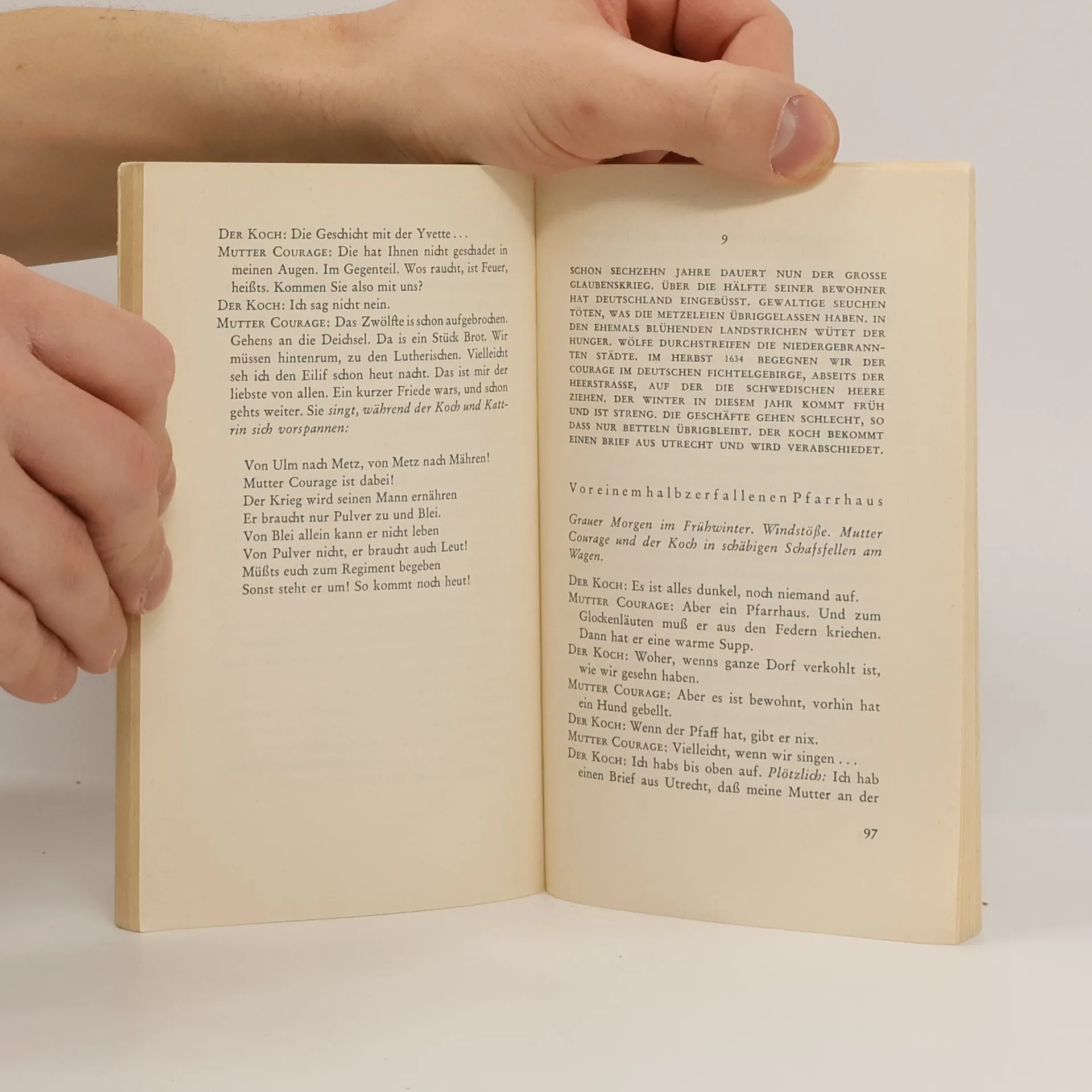 Mutter Courage und ihre Kinder, eine Chronik aus dem Dreißigjährigen Krieg. »Was eine Aufführung von Mutter Courage«, schrieb Brecht einmal, »hauptsächlich zeigen soll: Daß die großen Geschäfte in den Kriegen nicht von den kleinen Leuten gemacht werden. Daß der Krieg, der eine Fortführung der Geschäfte mit anderen Mitteln ist, die menschlichen Tugenden tödlich macht, auch für ihre Besitzer. Daß er darum bekämpft werden muß.«