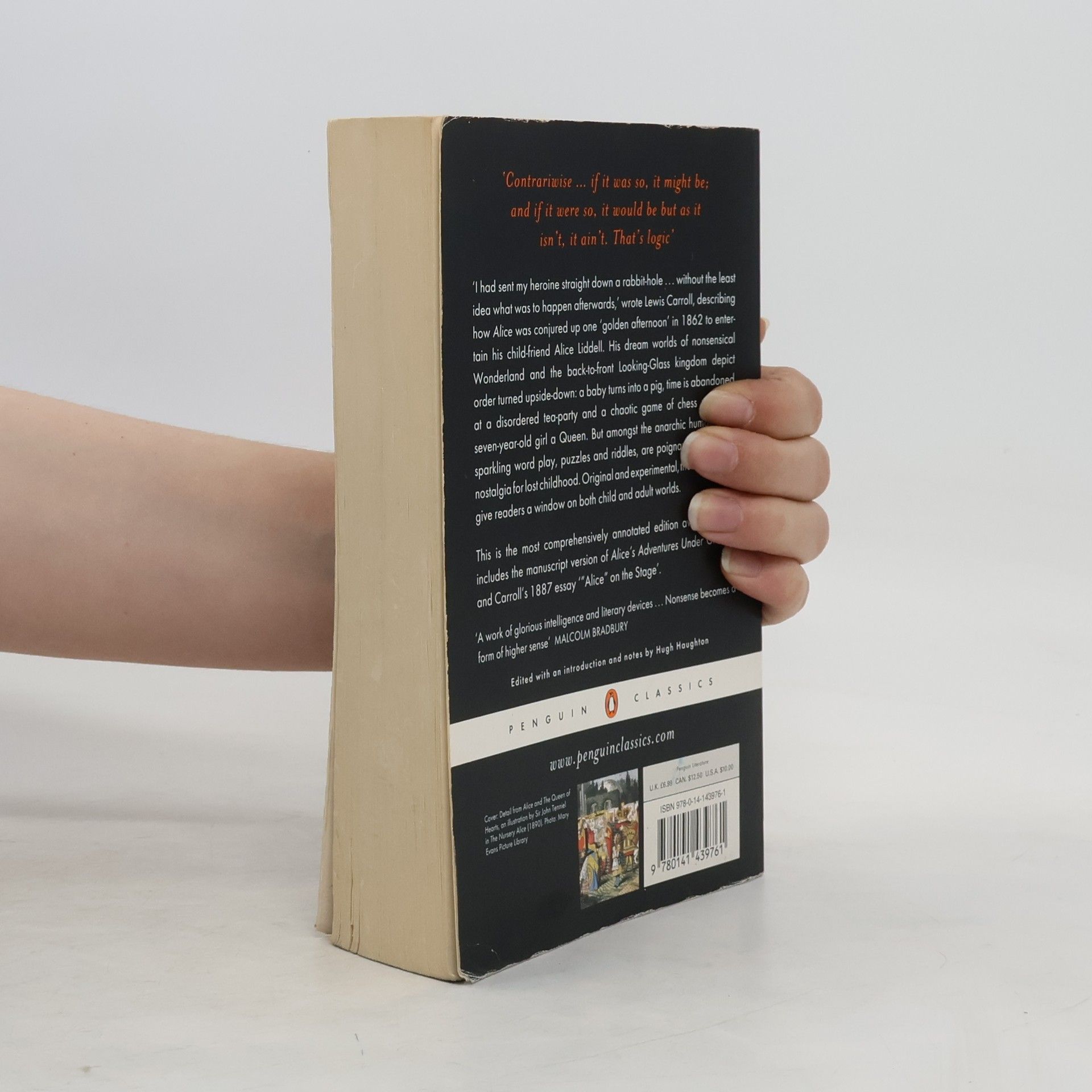 'Contrariwise ... if it was so, it might be; and if it were so, it would be but as it isn't, it ain't. That's logic.' 'I had sent my heroine straight down a rabbit-hole ... without the least idea what was to happen afterwards,' wrote Lewis Carroll, describing how Alice was conjured up one 'golden afternoon' in 1862 to entertain his child-friend Alice Liddell. His dream worlds of nonsensical Wonderland and the back-to-front Looking-Glass kingdom depict order turned upside-down: a baby turns into a pig, time is abandoned at a disordered tea-party and a chaotic game of chess makes a seven-year-old girl a Queen. But amongst the anarchic humour and sparkling word play, puzzles and riddles, are poignant moments of nostalgia for lost childhood. Original and experimental, the Alice books give readers a window on both child and adult worlds. This is the most comprehensively annotated edition available and includes the manuscript version of Alice's Adventures Under Ground and Carroll's 1887 essay '"Alice" on the Stage'. --back cover