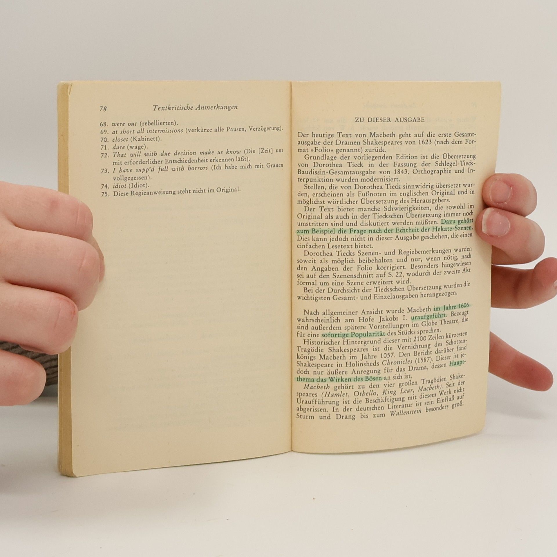 Das Buch zur Neuverfilmung. Zweisprachige Ausgabe mit der berühmten Übersetzung von Frank Günther und einem umfangreichen Anhang »Leben ist nur ein Wanderschattenspiel; ist eine Mär aus einem Tölpelmund, voll von Getön und Toben, und bedeutet nichts« So Macbeth im letzten Stadium des Überdrusses, kurz vor seiner Ermordung, die ihm willkommen ist wie eine Befreiung. Vorausgegangen ist ein beispielloses Spektakel von Machtgier, Verführung und Mord; Shakespeares kürzeste, konzentrierteste, eingängigste Tragödie. Drei Hexen prophezeien Macbeth, er werde einst König sein. Sogleich steigen Mordgedanken in ihm auf, die er vergeblich zu unterdrücken sucht. Bestärkt durch den blutigen Ehrgeiz seiner Frau Lady Macbeth, bringt er schließlich den amtierenden König Duncan im Schlaf um. Macbeth wird König, fürchtet aber weiterhin um seinen Rang. Nun muß der Feldherr Banquo dran glauben, dessen Geist bald darauf während eines Festmahles erscheint und Macbeth vollends verunsichert. Ein weiteres Mal sucht er die Hexen auf, die ihn in trügerischer Sicherheit wiegen: »Keiner, den ein Weib gebar«, wird ihm je schaden. Doch das Unglaubliche geschieht: als Rächer tritt Macduff auf, der einst »vor der Zeit aus dem Mutterleib geschnitten« ward. Macbeth, der nie die Anteilnahme des Zuschauers verloren hat, weil ihm seine Taten zu sehr auf der Seele lasten, geht unter, ebenso wie Lady Macbeth, die zuvor schon dem Wahnsinn verfallen war.