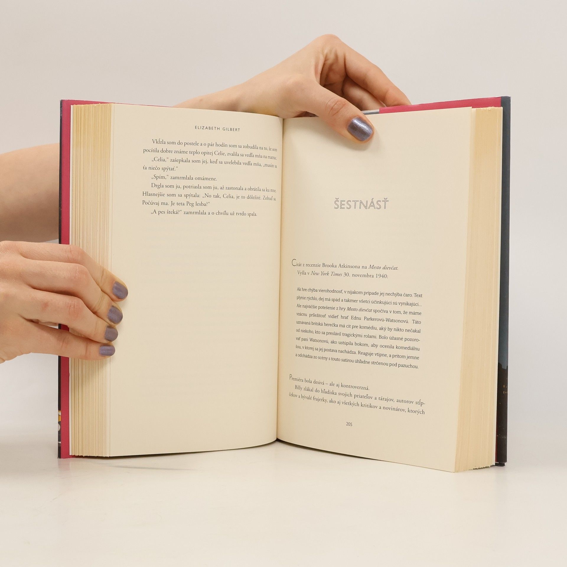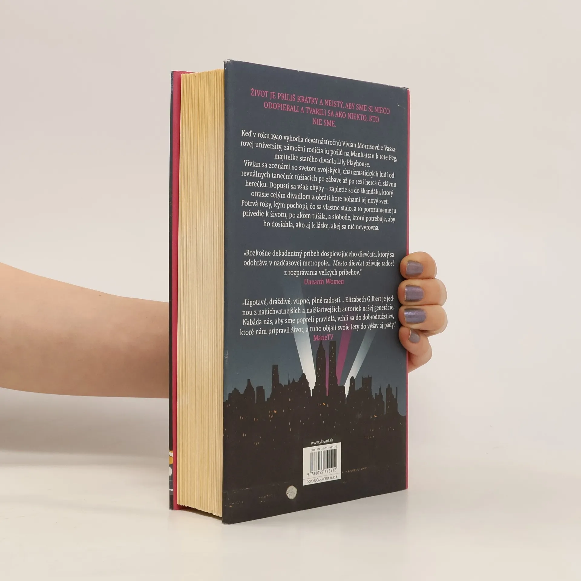 Nemusíme žiť nudne ako slušné dievčatá, aby sa z nás stali dobrí ľudia. Nový román autorky bestsellerov Podstata všetkých vecí a Jedz, modli sa a miluj. Elizabeth Gilbert sa vracia s podmanivým ľúbostným príbehom zo vzrušujúceho sveta newyorských divadiel v štyridsiatych rokoch 20 storočia. Keď devätnásťročnú Vivian Morrisovú vyhodia z Vassarovej univerzity za slabý výkon v prvom ročníku, zámožní rodičia ju pošlú na Manhattan k tete Peggy, majiteľke spustnutého divadla Lily Playhouse. Vivian sa u tety zoznámi so svetom nekonvenčných a charizmatických ľudí, od revuálnych tanečníc, ktoré snívajú iba o zábave, až po sexi herca či prestížnu herečku. Dievča sa však dopustí chyby, ktorá vyvolá profesionálny škandál a obráti jej krásny nový svet naruby.