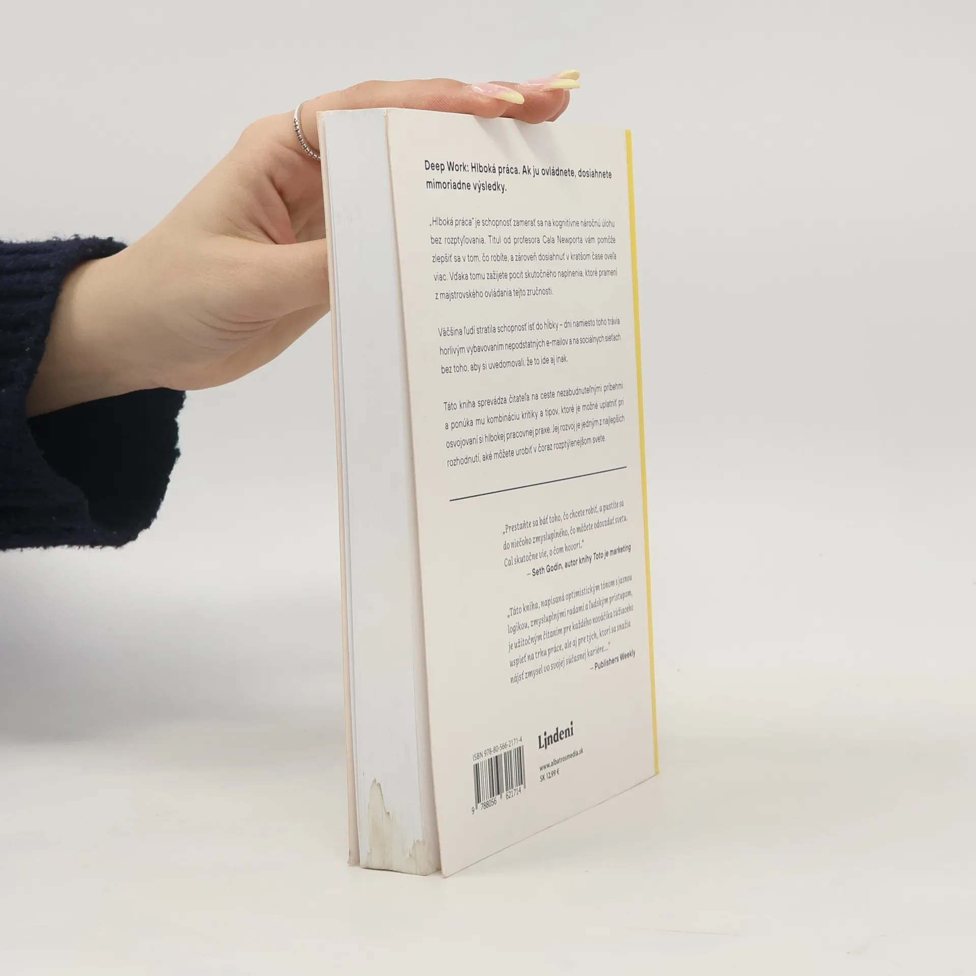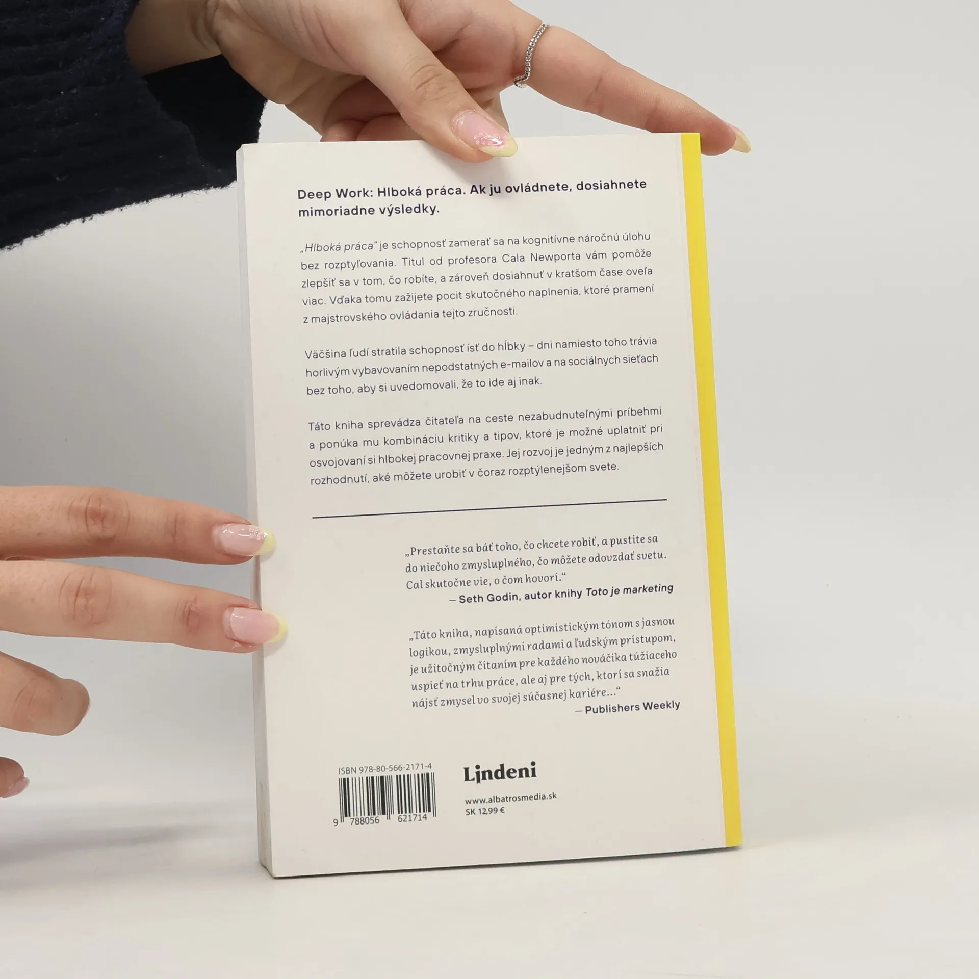 Ak ju ovládnete, dosiahnete mimoriadne výsledky. „Hlboká práca“ je schopnosť zamerať sa na kognitívne náročnú úlohu bez rozptyľovania. Titul od profesora Cala Newporta vám pomôže zlepšiť sa v tom, čo robíte, a zároveň dosiahnuť v kratšom čase oveľa viac. Vďaka tomu zažijete pocit skutočného naplnenia, ktoré pramení z majstrovského ovládania tejto zručnosti. Väčšina ľudí stratila schopnosť ísť do hĺbky – dni namiesto toho trávia horlivým vybavovaním nepodstatných e-mailov a na sociálnych médiách, bez toho aby si uvedomovali, že to ide aj inak. Táto kniha sprevádza čitateľa na ceste nezabudnuteľnými príbehmi a ponúka mu kombináciu kritiky a tipov, ktoré je možné uplatniť si pri osvojovaní hlbokej pracovnej praxe. Jej rozvoj je jedným z najlepších rozhodnutí, ktoré môžete urobiť v stále viac rozptýlenom svete. „Prestaňte sa báť toho, čo chcete robiť, a pustite sa do niečoho zmysluplného, čo môžete odovzdať svetu. Cal skutočne vie, o čom hovorí.“ -Seth Godin, autor knihy Toto je marketing „Táto kniha, napísaná optimistickým tónom s jasnou logikou, zmysluplnými radami a ľudským prístupom, je užitočným čítaním pre každého nováčika túžiaceho uspieť na trhu práce, ale aj pre tých, ktorí sa snažia nájsť zmysel vo svojej súčasnej kariére...“ -Publishers Weekly