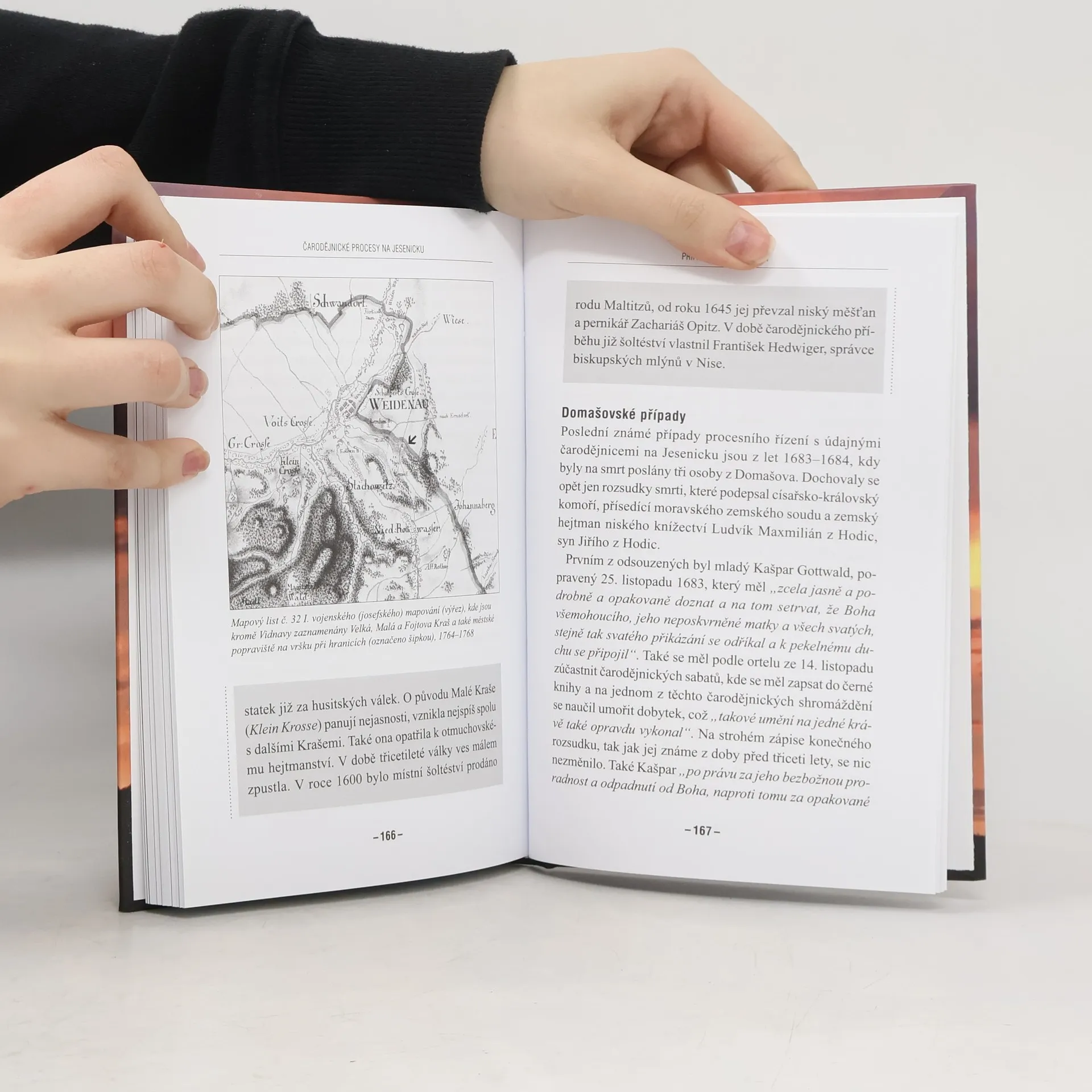 Čarodějnické procesy na Jesenicku v 17. století byly tak rozsáhlé, že jsou považovány za největší masový hon na čarodějnice v Slezsku, překračující známější případy na Losinsku a Šumpersku. Autorka čerpá z dobových písemných pramenů z českých a polských archivů a poprvé je představuje českým čtenářům. Zmiňuje výjimečný případ Barbory Schmiedové z roku 1622, obviněné svým mužem z čarování, otravy a žhářství, což vedlo k vyšetřování a pronásledování desítek lidí. Další kapitola se věnuje silné vlně procesů, kdy byla postavena pec na čarodějnice kvůli velkému počtu popravovaných. Příběh z roku 1651 popisuje udání šesti lidí z údajné účasti na sabatu, což vedlo k soudnímu řízení s použitím tortury a následnému rozšíření procesů, při nichž desítky lidí skončily na popravištích. Třicetiletá válka, pustošení oblasti, epidemie a hladomor přispěly k hledání obětního beránka – čarodějnic. Když pronásledování dosáhlo kritického bodu, vzbouřilo se měšťanstvo a vrchnost, což vedlo k zastavení honu biskupem z královské rodiny.