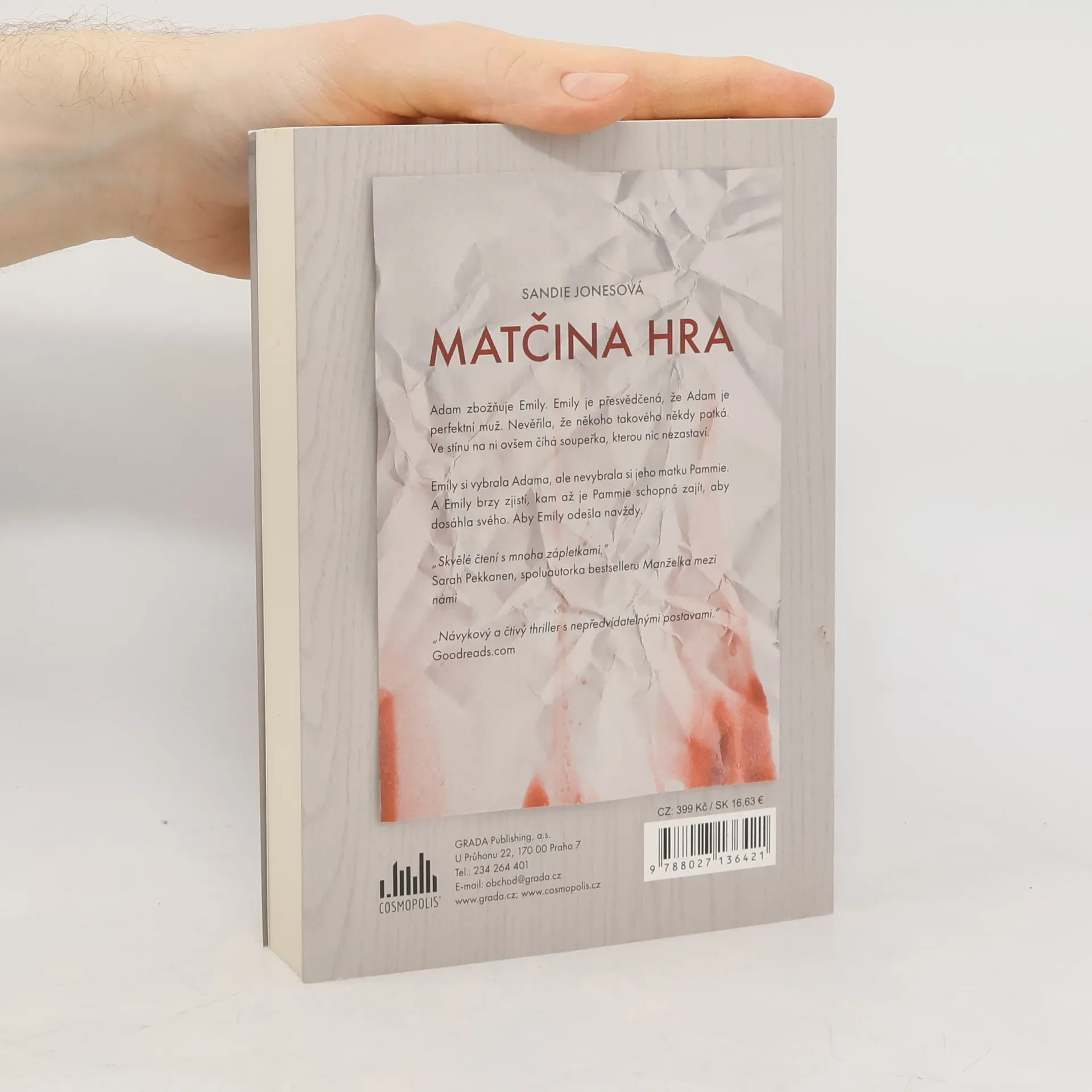 Návykový psychologický thriller plný nečekaných zvratů o ničivém vztahu mezi Emily, jejím přítelem Adamem a jeho matkou Pammie. Ukazuje, jak mocná může být síla manipulace a že všechno nemusí být tak, jak se na první pohled zdá. ON TĚ MILUJE: Adam zbožňuje Emily. Emily je přesvědčená, že Adam je perfektní muž, jakého nevěřila, že někdy potká. ALE ONA TEBE NE: Ve stínu číhá soupeřka, žena, kterou s jejím milovaným spojuje hluboké pouto. NIC JI NEZASTAVÍ: Emily si vybrala Adama, ale nevybrala si jeho matku Pammie. Neexistuje nic, co by matka neudělala pro svého syna. A Emily zjistí, kam až je Pammie schopná zajít, aby dosáhla svého. Aby Emily odešla navždy.