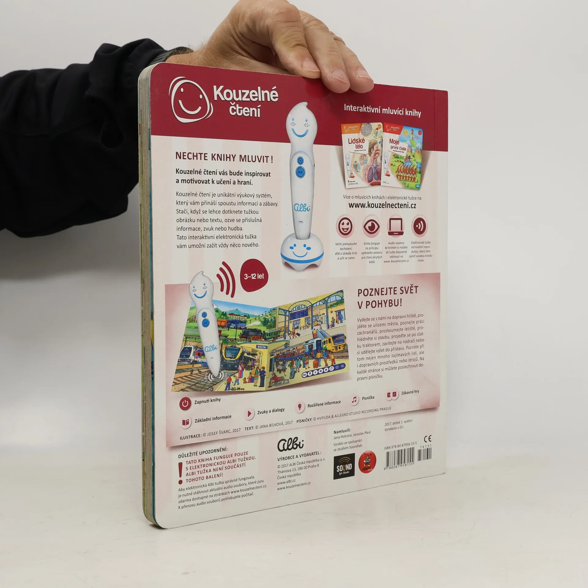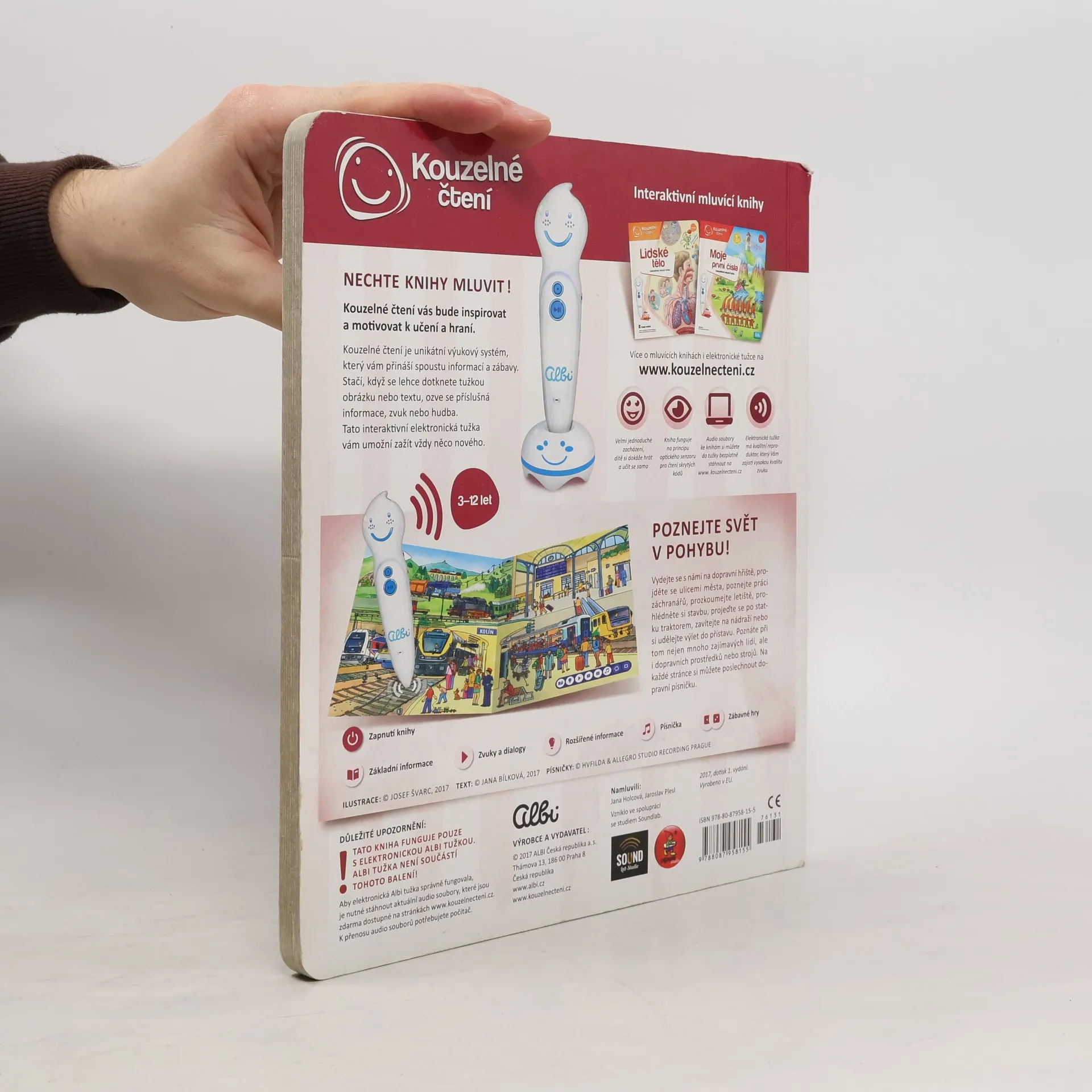nteraktivní naučná kniha Doprava z edice Kouzelné čtení zavede děti od 3 let do světa dopravních prostředků a strojů. Vydají se na dopravní hřiště, projdou se ulicemi města, poznají práci záchranářů, prozkoumají letiště, prohlédnou si stavbu, projedou se po statku traktorem, zavítají na nádraží a udělají si výlet do přístavu. Interaktivní mluvící kniha Naučí děti bezpečnosti v silničním provozu, poznají dopravní značky a dozví se spoustu užitečných informací ze světa dopravy a strojů. Na každé stránce knihy Doprava si děti poslechnou zábavnou a poučnou dopravní písničku. V knize Doprava se mohou dozvědět i řadu technických detailů o fungování nejrůznějších strojů. Kniha Doprava obsahuje přes 2 000 zvuků a textů. Je namluvena Janou Holcovou a Jaroslavem Pleslem a ilustrovaná Josefem Švarcem.