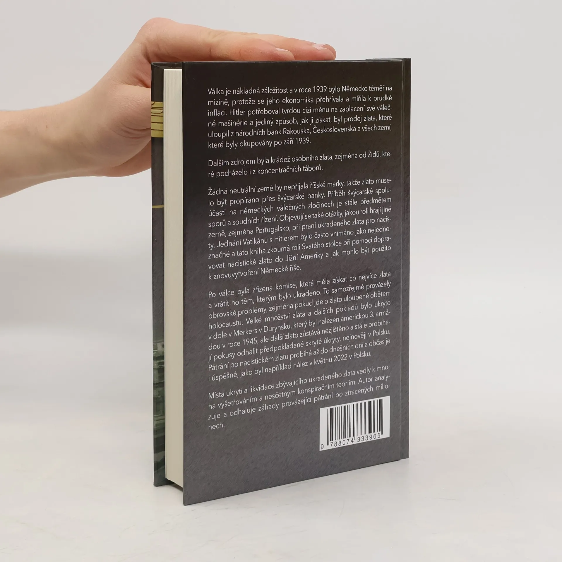 V roce 1939 bylo Německo na pokraji ekonomického kolapsu a Hitler potřeboval tvrdou měnu na financování války. Jeho jedinou možností bylo prodat zlato ukradené z národních bank zemí, které okupoval, a také osobní zlato, zejména od Židů, včetně zlata z koncentračních táborů. Protože žádná neutrální země neakceptovala říšské marky, zlato muselo být prané přes švýcarské banky. Spoluúčast Švýcarska na německých válečných zločinech je stále předmětem sporů a soudních řízení. Kromě toho se zkoumá role Portugalska při praní zlata pro nacisty a nejednoznačné jednání Vatikánu s Hitlerem, včetně pomoci při transportu zlata do Jižní Ameriky. Po válce byla zřízena komise k navrácení ukradeného zlata, což však vyvolalo komplikace, zejména ohledně zlata obětí holocaustu. Americká armáda objevila velké množství zlata v dole v Merkers, ale další úkryty zůstávají neznámé. Pátrání po nacistickém zlatu pokračuje dodnes, s nedávnými úspěchy, jako byl nález v Polsku v květnu 2022. Tato témata vedla k mnoha vyšetřováním a konspiračním teoriím, které autor analyzuje a odhaluje záhady spojené s hledáním ztracených miliónů.